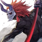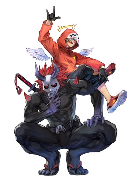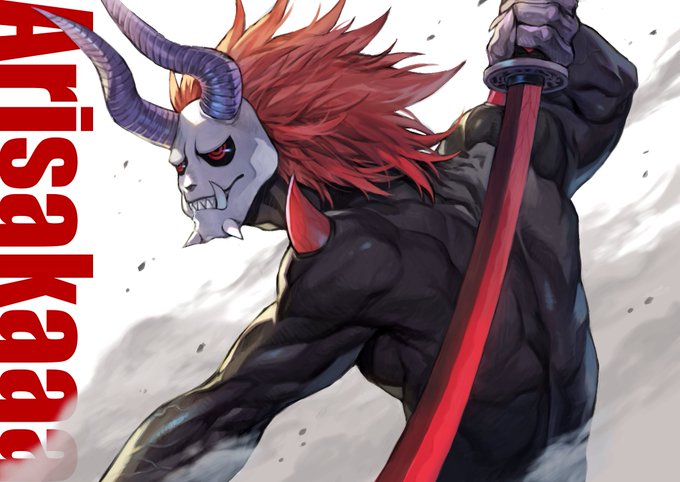 ありさかさんのこの異形デザインがめちゃ好きなのに描くとめちゃ難しくて何度も描いては消しを繰り返している間に人型デザインも生まれていた… どちらもかっこいいですよね… お面グッズ化されないかな〜夜店にありそうなやつ…👹 #Arisakaaa
