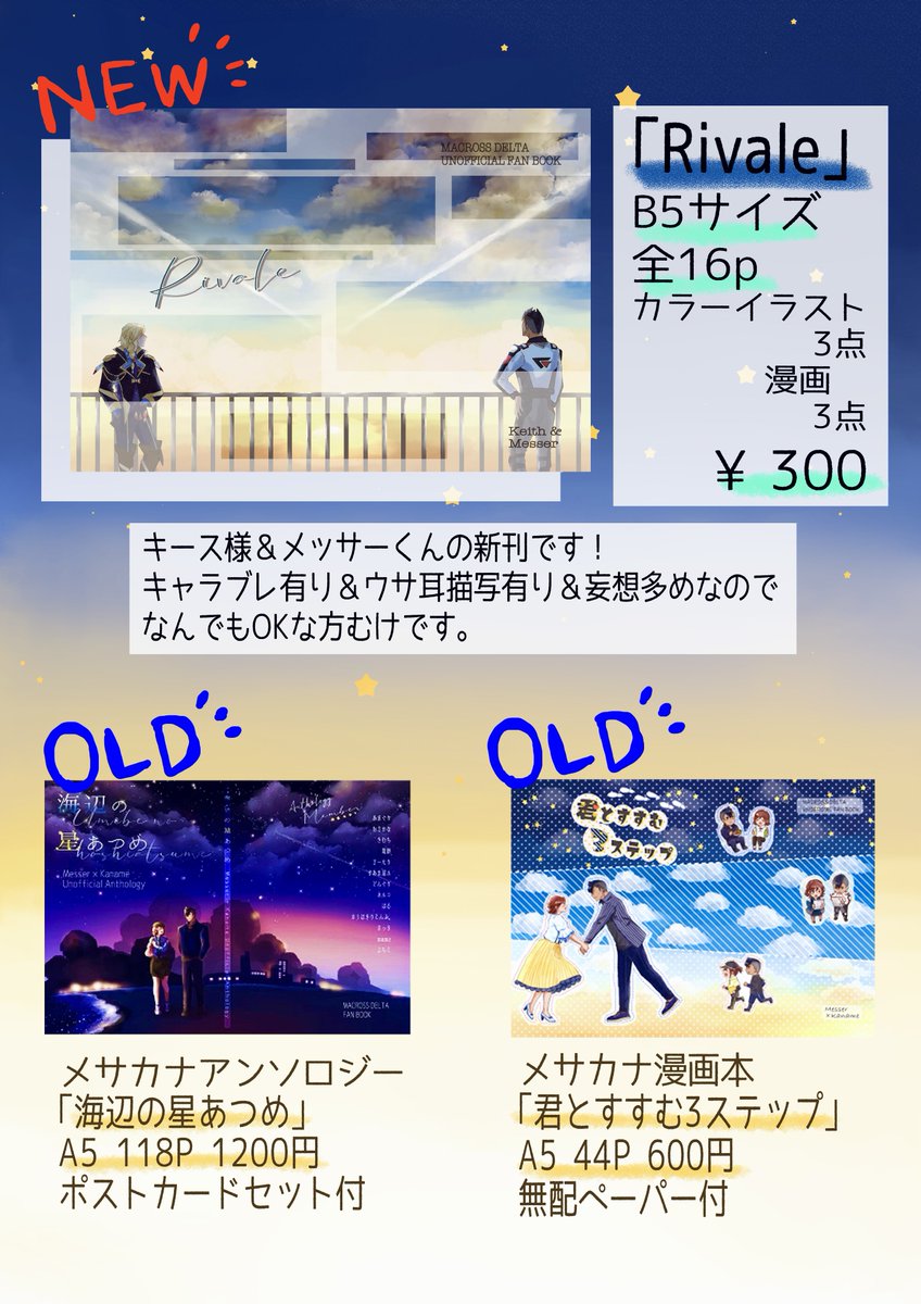 【#コミケ102 新刊情報】 イベント当日のおしながきです📕 画像1枚目は、はるさん(@haru_ruah )とのメサカナ合同誌詳細となりますー! 画像2枚目はキスメサ新刊と既刊の詳細です🌟 ※リプ欄へ続きます pixiv.net/artworks/11059…