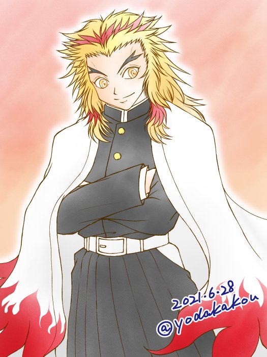 3 4 相方が鬼滅の刃の中で一番好きな煉獄さん 入院中で色々しんどいだろうから、少しでも励みになればと描いて、深夜に送り付けた。初描きだから苦労した💧 #煉獄杏寿郎 21/06/28 00:30