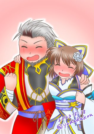 1 1 #今月描いた絵を晒そう 今月のガチ絵はこの2つです。どちらも描くのが大変でしたが、楽しかったです #イサシズ 水月鏡花8周年記念、酔っ払いの2人 #ゲオエク +闇エクセと女(自分)同士の戦い 23/05/31 18:55