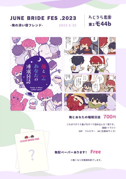 2023/06/25 JUNE BRIDE FES 2023 💀俺の添い寝フレンド📘 【東2ホール モ44b ろじうら農園】 ミス晶♂オンリーのお品書きです。 ※新刊は今のところ通販の予定はしておりません。 無配ペーパーも頒布予定です~よろしくお願いいたします pixiv.net/artworks/10916…