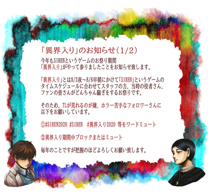 【フォロワーの皆様へお願い】 今年も異界入りの季節がやってきました。そこで「異界入りって何?」という方&ホラーが苦手な方にお願いがあります。御手数ですが、1枚目の画像を見ていただけると嬉しいです。 それでは、よい異界入りを! #SIREN2020 #異界入り2020