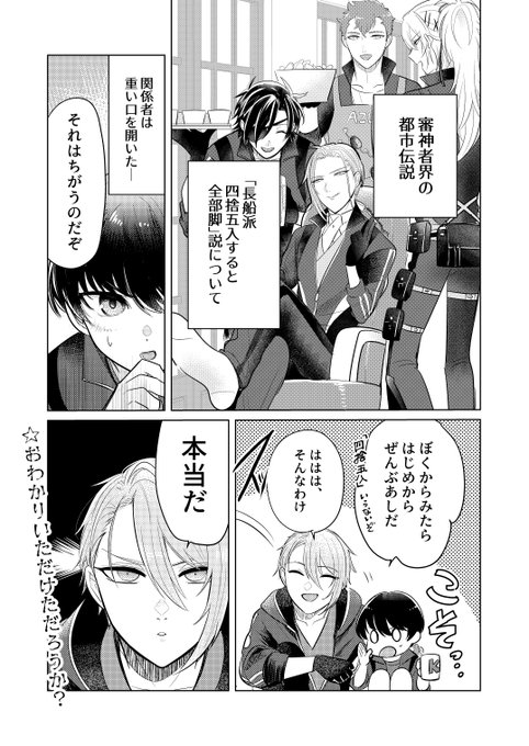 55 198 【「おわかりいただけただろうか?」】 ※燭台切、大般若、小竜、小豆、謙信、おまけで長義いつもの お題箱から「四捨五入したら全部脚~だって長船だもの~」 21/08/24 12:00