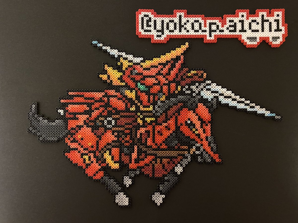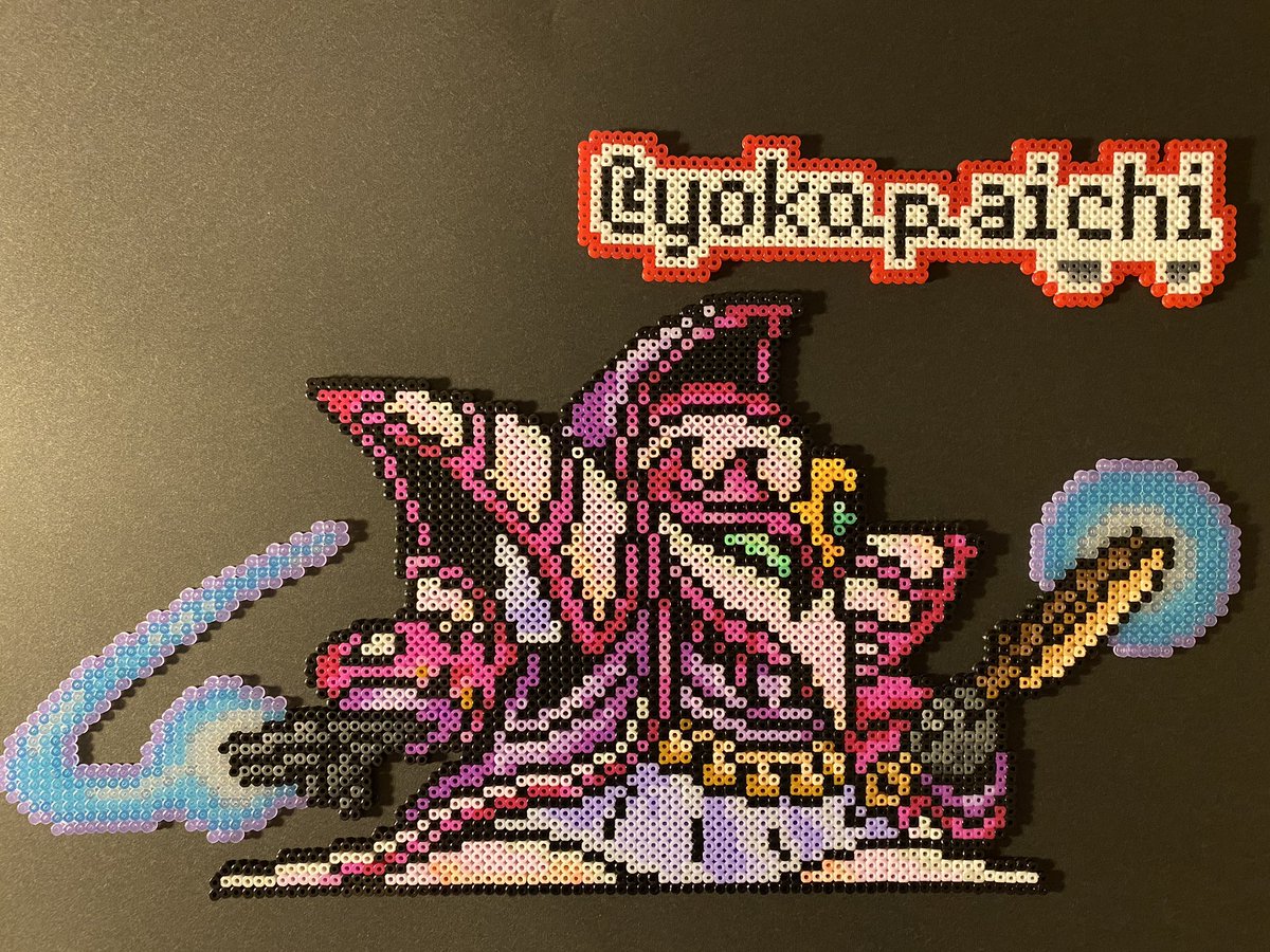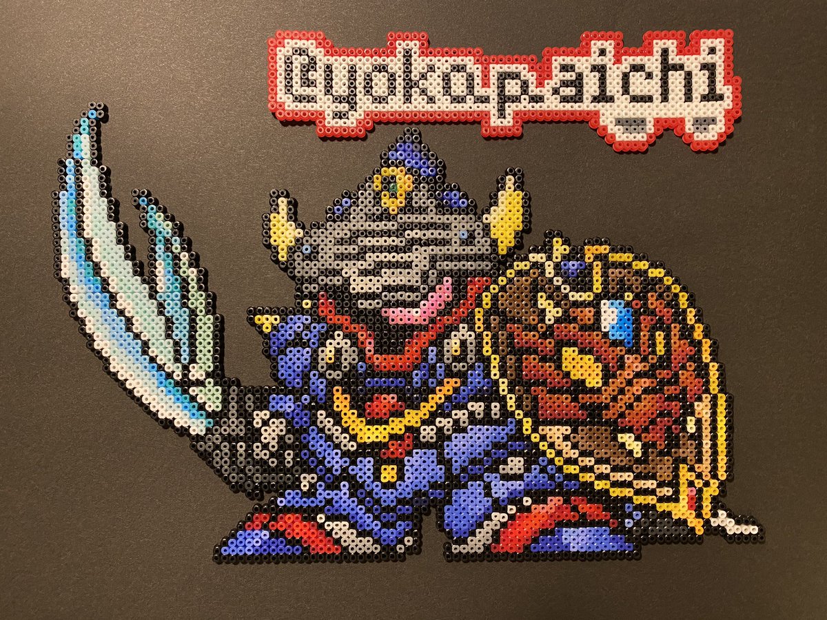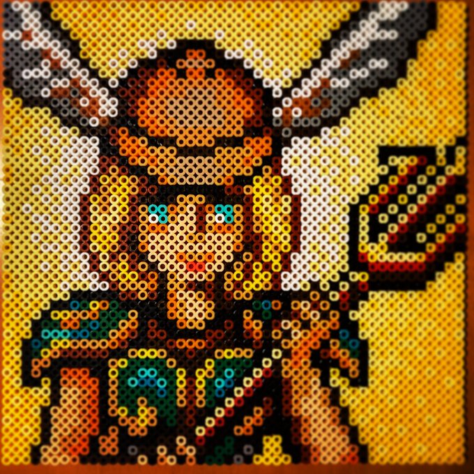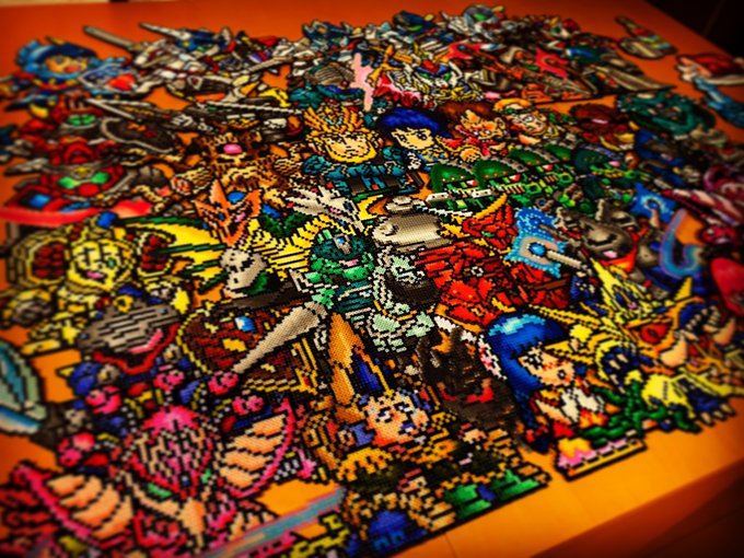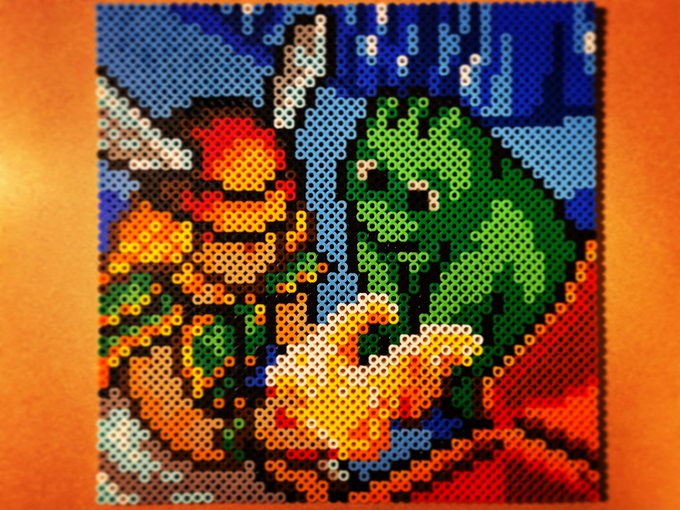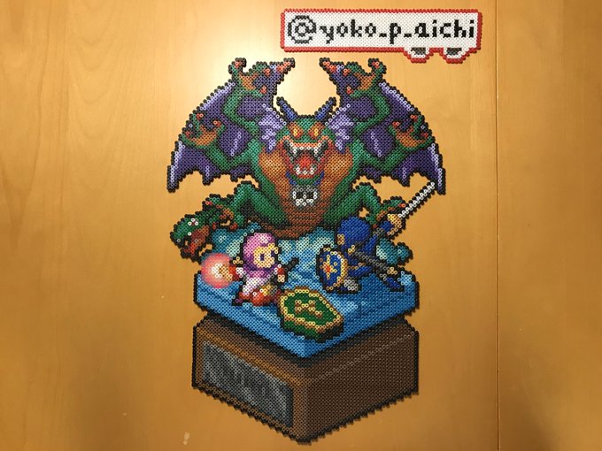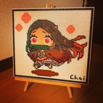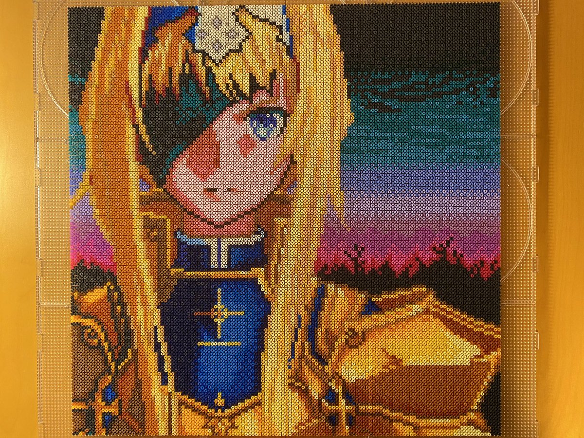 昨日チラッと写ってしまったので公開しますが @kirai_s 鬼雷昇炎さんのドット絵を4面分割で 作ってみたのですが、アイロンをかけたら 互いのパネルにズレが生じて失敗しました💧 並べた労力だけでも労ってください #ドット絵 #pixelart #ワルキューレの冒険 #アイロンビーズ #ミニフューズビーズ