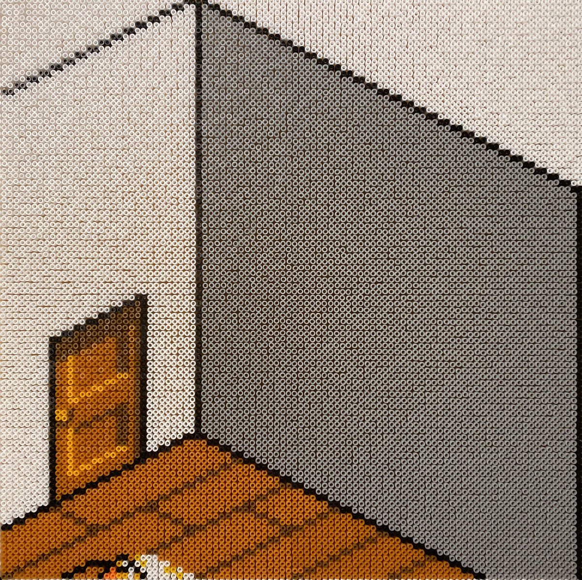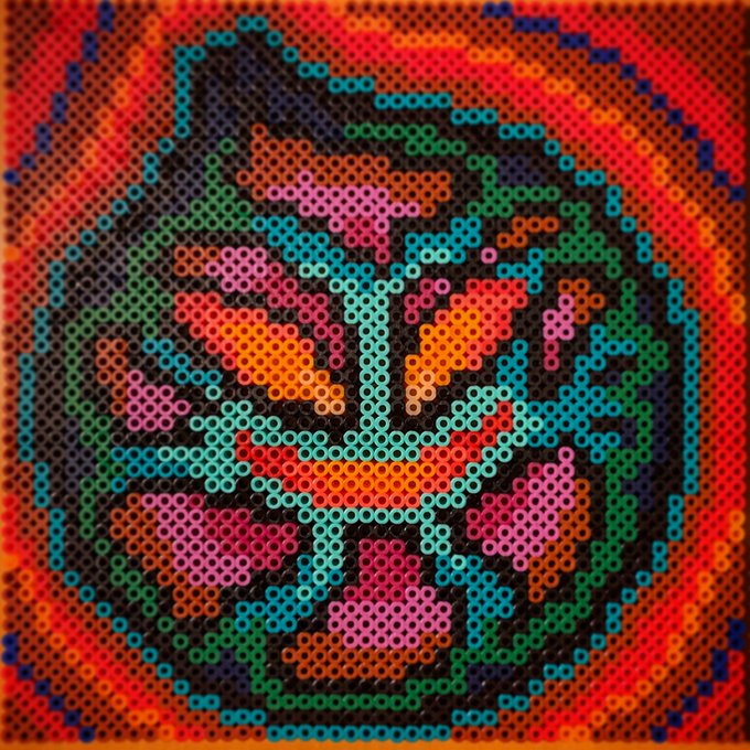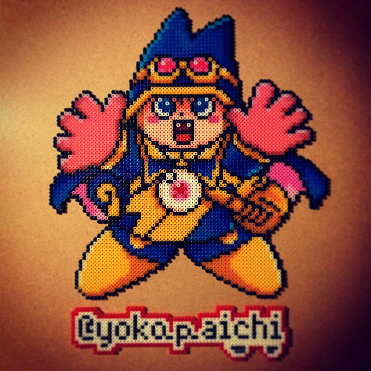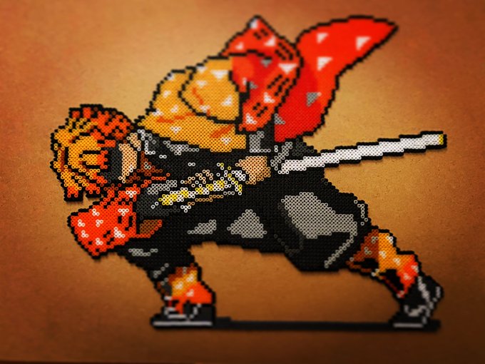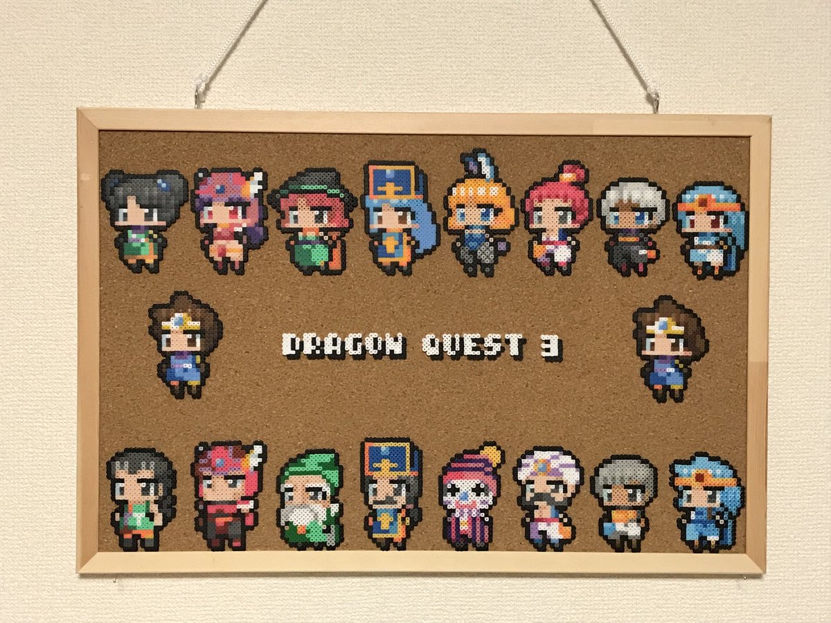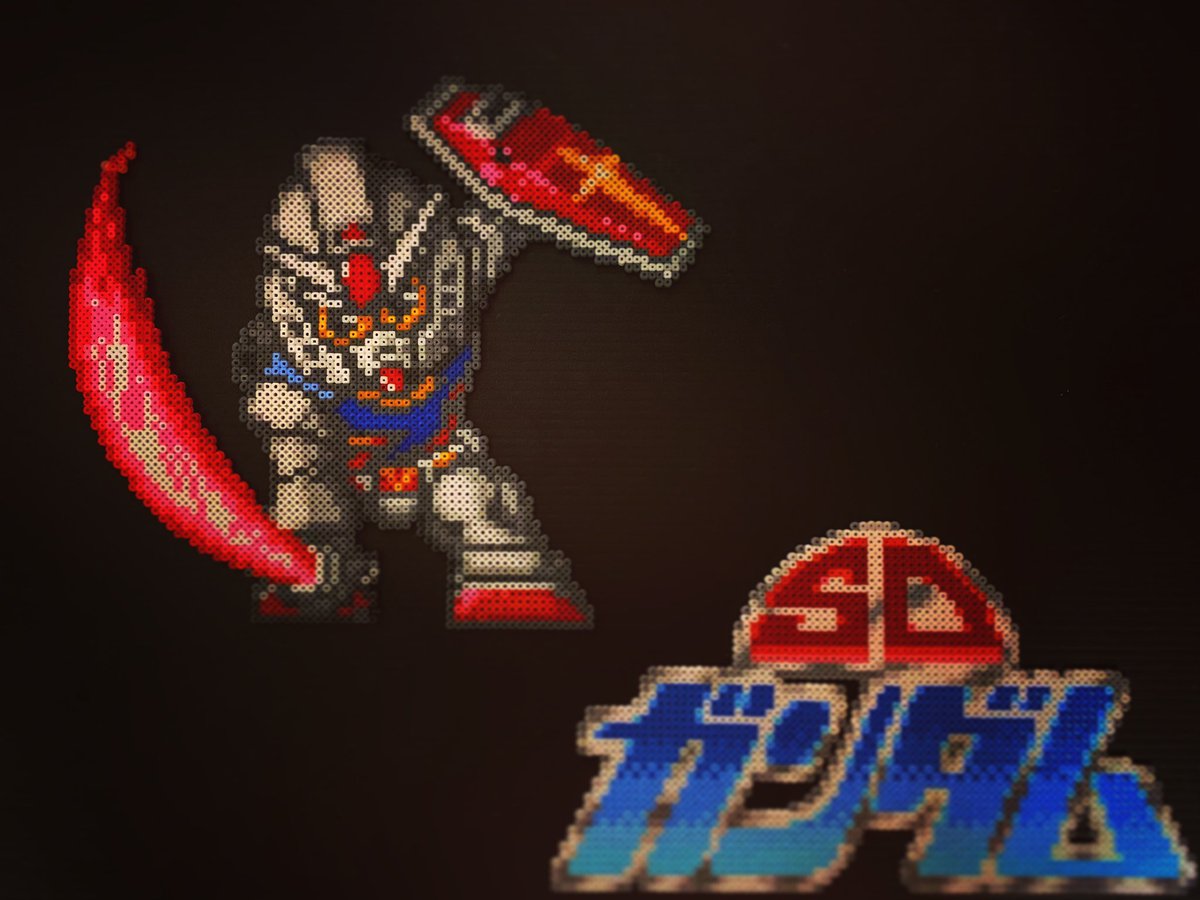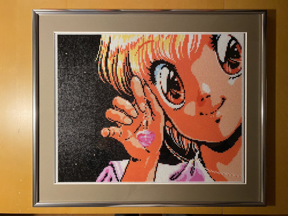 昨日チラッと写ってしまったので公開しますが @kirai_s 鬼雷昇炎さんのドット絵を4面分割で 作ってみたのですが、アイロンをかけたら 互いのパネルにズレが生じて失敗しました💧 並べた労力だけでも労ってください #ドット絵 #pixelart #ワルキューレの冒険 #アイロンビーズ #ミニフューズビーズ
