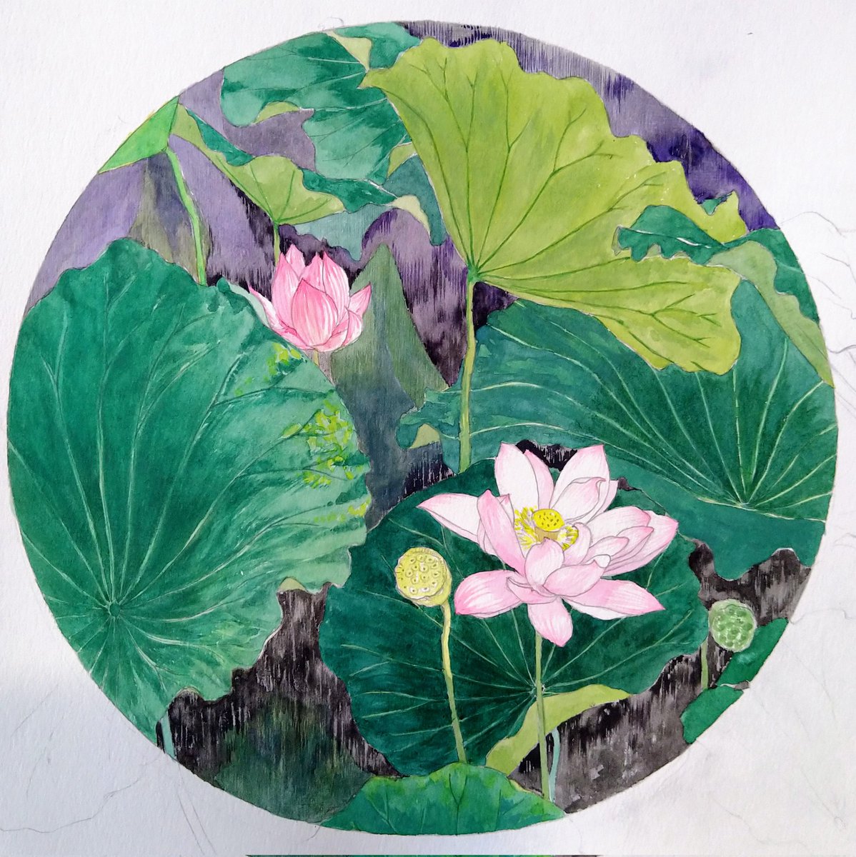 小下図。 先日取材に行っていた蓮。 直径600で制作予定。 クライアントより、もう少し花と蕾と種を大きめで、とのことなので、構図はまだ微調整が必要。 バックは銀箔を焼く大好きな技法で。 本画制作が凄く楽しみ! #日本画 #小下図 #蓮 #水彩