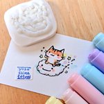 3 6 もくもく号☁️ΞΞ3 こちらも再販(^-^; 今っぽい猫にしてみたけど、雲にも顔があるから立体的にするの難しい💦 夢色カラーが似合う🎨(猫は焦がし過ぎた…スマヌorz) #消しゴムはんこ #けしはん #ほるナビ #コピック #シヤチハタ #ねこ #ぬこ #猫 #猫部 #cat 22/01/19 12:41