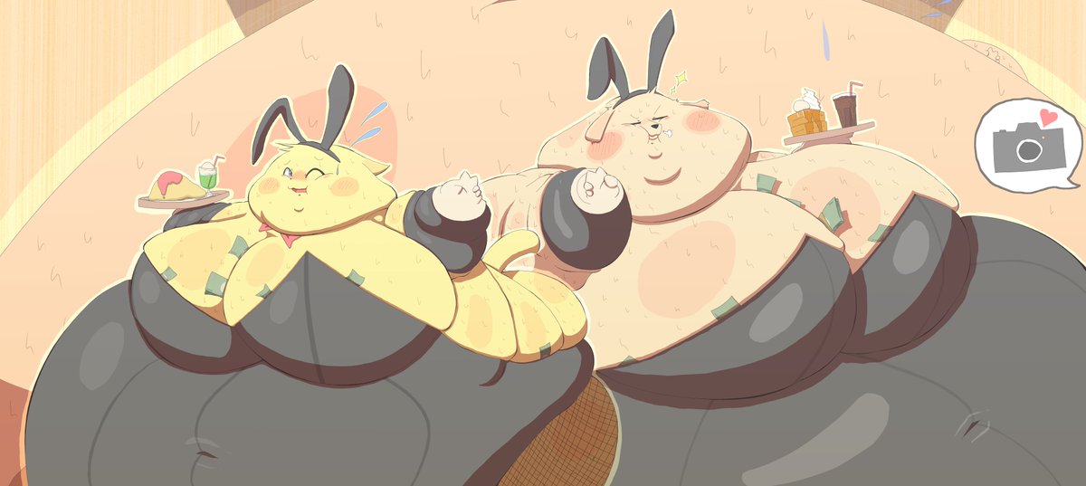 描き初め&肉の日絵!!コレはバイト先のバニー服カフェで、撮影に応じるロイくんとおのぼりくんと…?🐱💦🐶✨📷💥💥💥