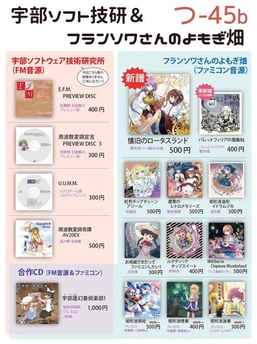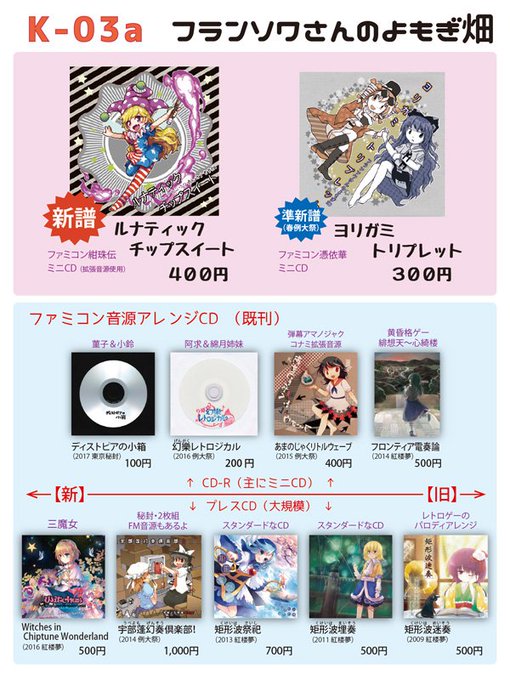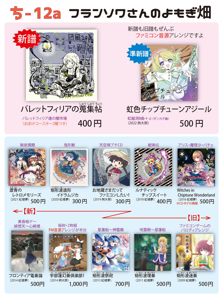 【11/28東方紅楼夢のお知らせ】 サークル「フランソワさんのよもぎ畑」、新譜が出ます! 東方剛欲異聞のファミコン音源アレンジです!! yomogi-farm.sakura.ne.jp/rekisei/ 視聴とかお品書きとかはすみません、まだ準備中ですので、後ほど、このツイートにぶら下げていきます!