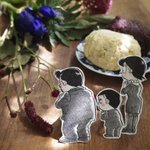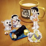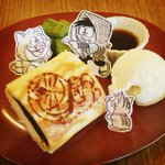 #Fミュ の #カフェメニュー『どら焼きロール』に、のび太くんのご先祖「のび作」と亥ドラを添えて、ご先祖さまがんばれバージョン。 #ドラえもん