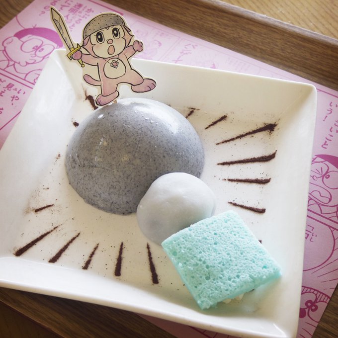 Fミュのカフェメニュー『石ころぼうしムースケーキ』 石ころぼうしをスイーツにしようと思った方のセンス、最高に好き♪ #ドラえもん #美夜子 #魔界大冒険 #藤子・F・不二雄ミュージアム