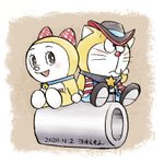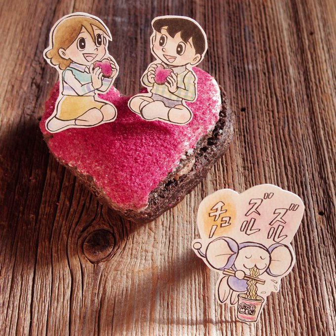 37 152 #Fミュ の #カフェメニュー『どら焼きロール』に、のび太くんのご先祖「のび作」と亥ドラを添えて、ご先祖さまがんばれバージョン。 #ドラえもん 19/01/05 01:24
