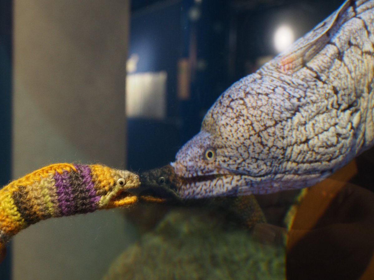 明日から#がまごおり深海魚まつり始まります🐟 ウツボの新色できましたよ。 スレッドの最後に会場のアクセスとブースの位置がわかる地図とイベントのチラシがあります。 #あみぐるみ #amigurumi #crochet #ウツボ #靭 #たけすい