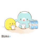 牛乳飲みながらおしゃべりする ウシのモコとヒヨコのピコ 冷たい牛乳もおいしいね #イラスト #ウシのモコ #ヒヨコのピコ #モコニコピコ #牛乳 #お絵描き #動物イラスト