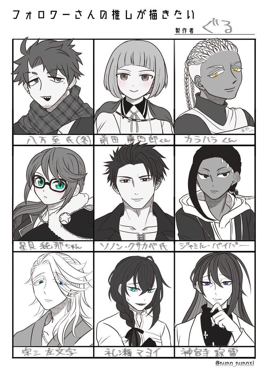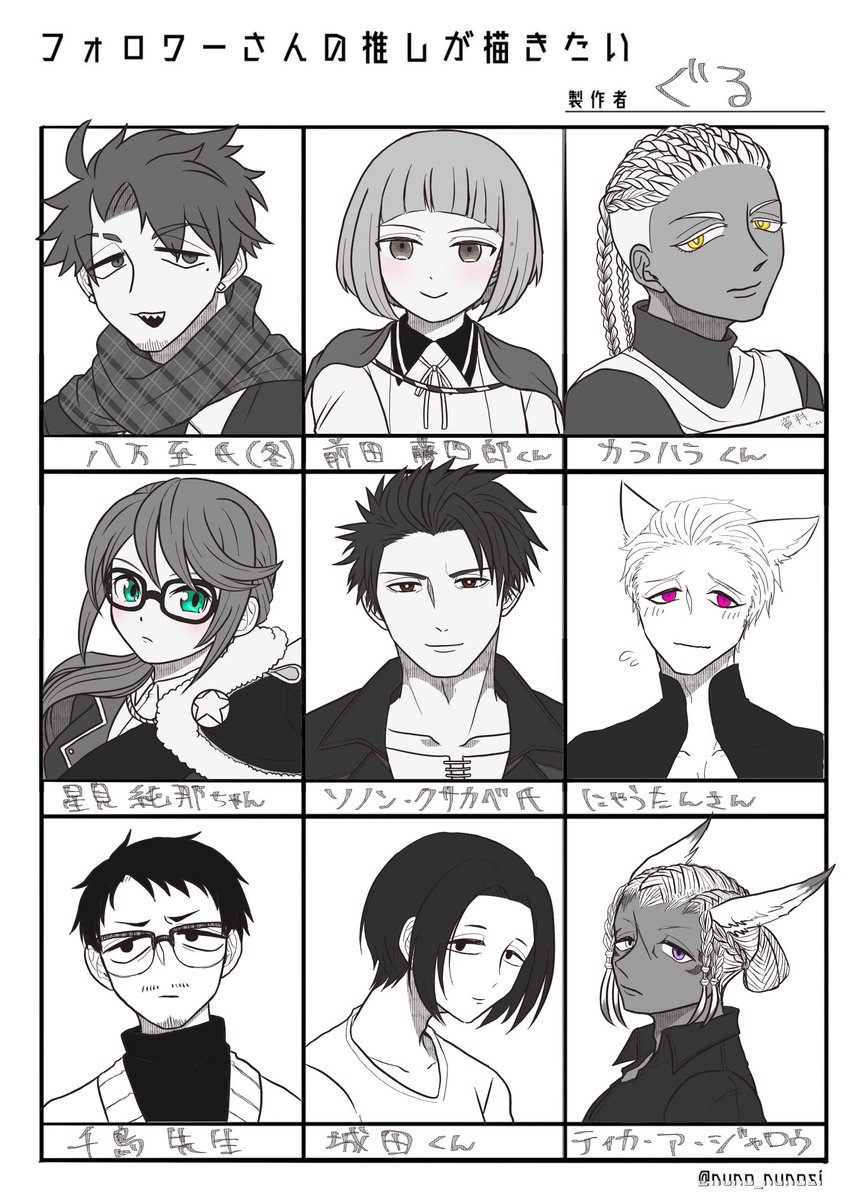 お待たせしました。四枠あまったので版権の推しとひとんちの推しを勝手に描きました。まちがえてたらこっそりおしえて(?) #フォロワーさんの推しが描きたい