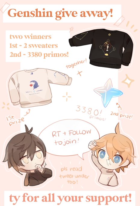 ✨🌸GENSHIN SWEATER GIVE AWAY🌸✨ ✨To celebrate 2k follows, my birthday and the kickstarter being successfully funded (the stars really aligned LMAO)✨ 🌸2 SWEATERS will be given away to one winner + second prize of 3380 primos* 🌸FOLLOW + RT TO ENTER! #GenshinImpact #原神