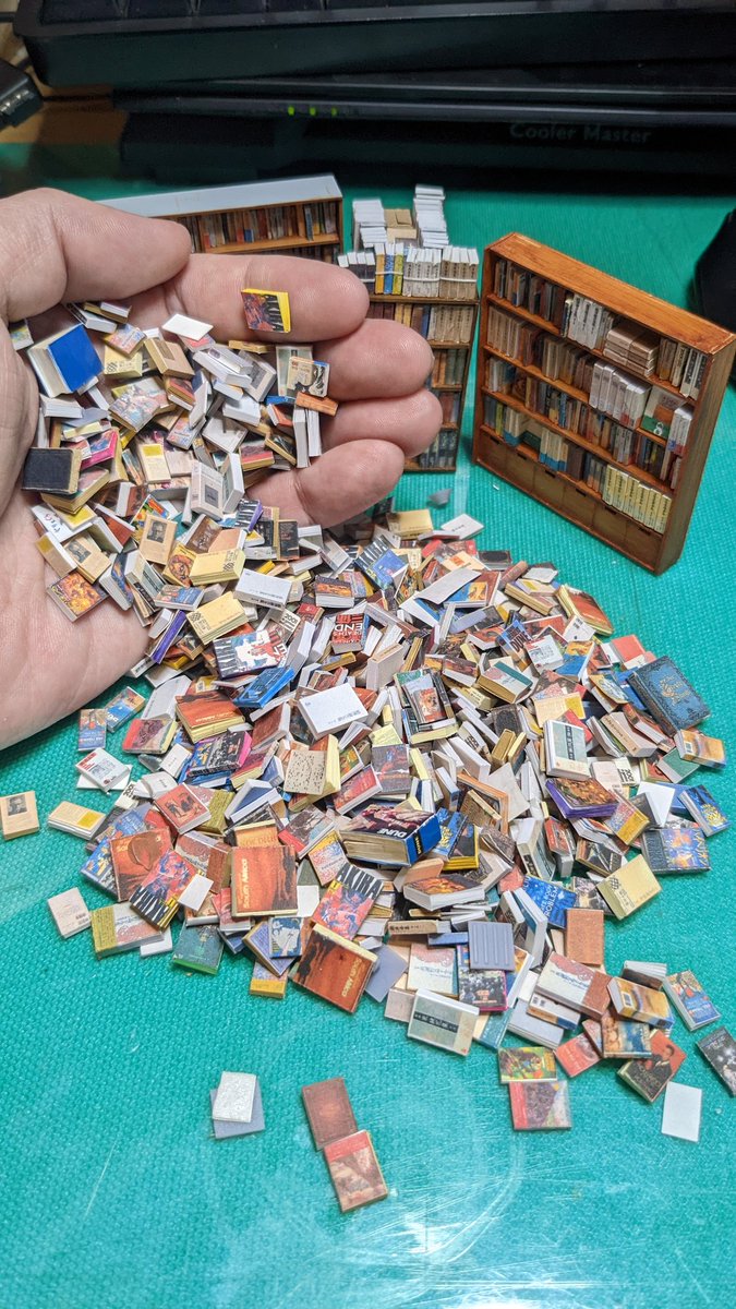 一冊ずつ、ミニチュア本を本棚に並べてる時の無心感。 出来上がったときの達成感。 手に取って眺めているときの眼福感。 ミニチュア製作の麻薬的な愉悦ですね〜、たまらん!