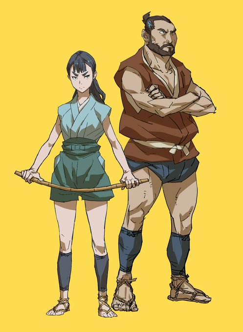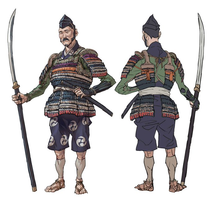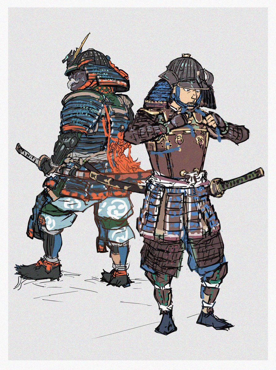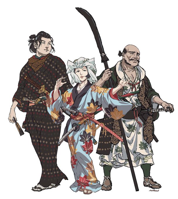 気に入った装束描くやつ3人目は歌舞伎 乱世が終わったばかりの江戸時代前期。華やかな格好の若者がいる一方乱世を生き抜いた厳つい侍もいたりする。ストーリーが始まる感ある。