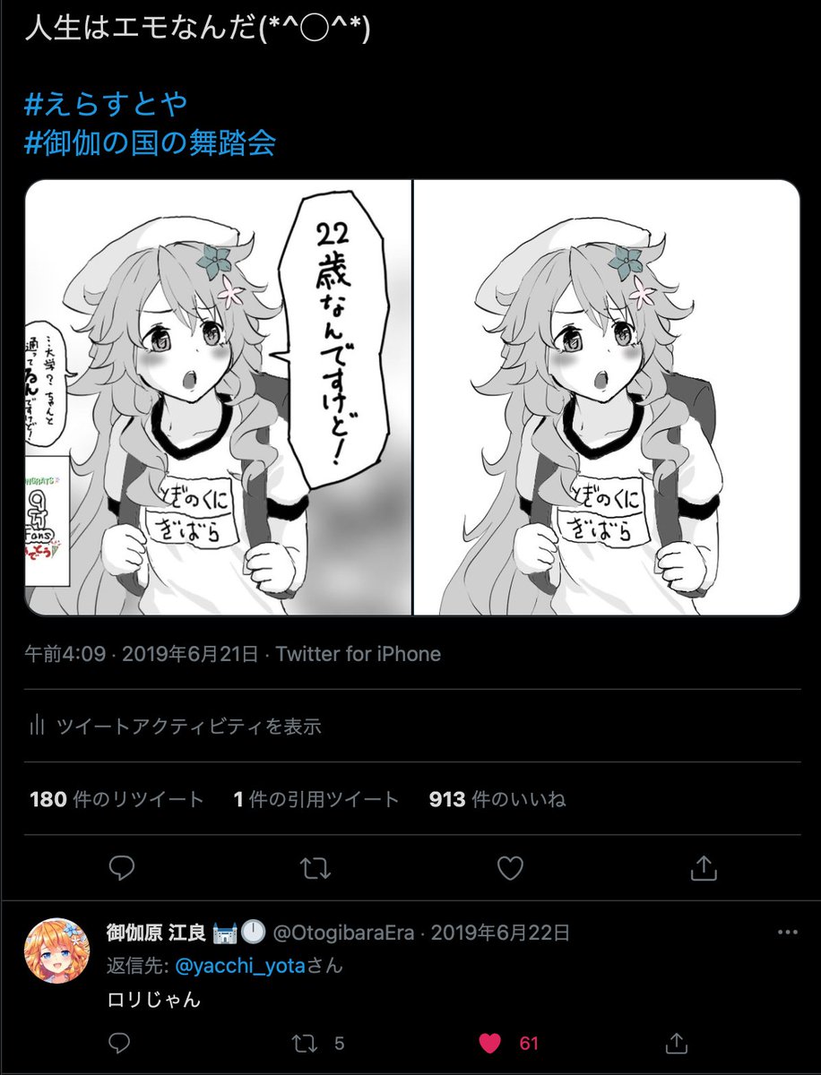 22 136 9万人登録記念配信で自己の年齢を強調する御伽原江良 返信貰えてめちゃ嬉しかったのに返事が思い付かなくて苦し紛れのいいね返しする陰キャワイ #えらすとや 21/03/31 22:23