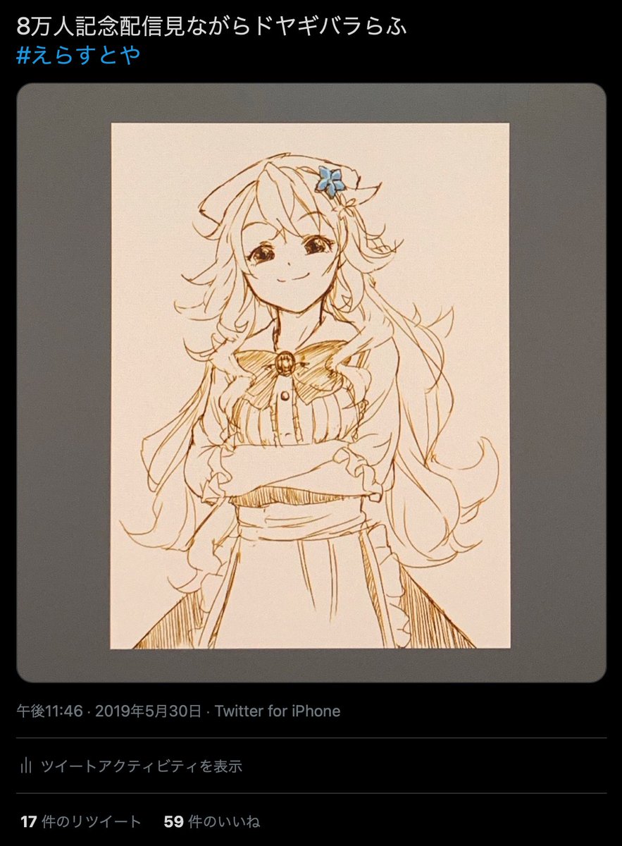 7 66 昔の垢で上げてた、恐らく初めて描いた御伽原江良 8万人登録を祝ってたのと、画質的にモニターを直接撮ったっぽいのが分かる #えらすとや 21/03/31 21:56