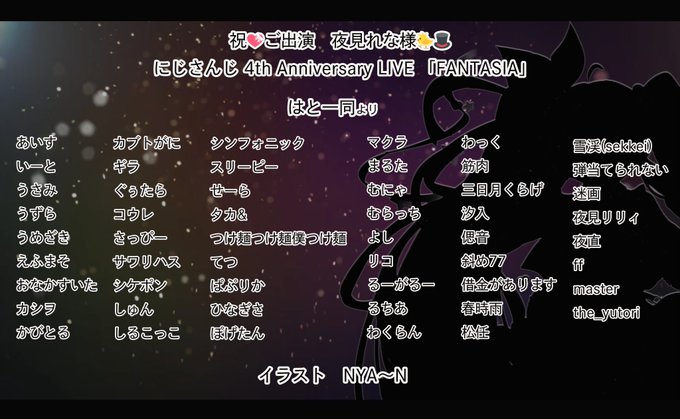 素敵な夜見さんイラスト NYA~N様(@kawa11_FES) 参加者 はと一同 企画 夜見さんのはと 楽屋花製作 F2O様(@F2O_FlowerStand) #FANTASIA #FANTASIA祝い花 #夜見れな #れなの鳥っくあーと #fantasia_day1