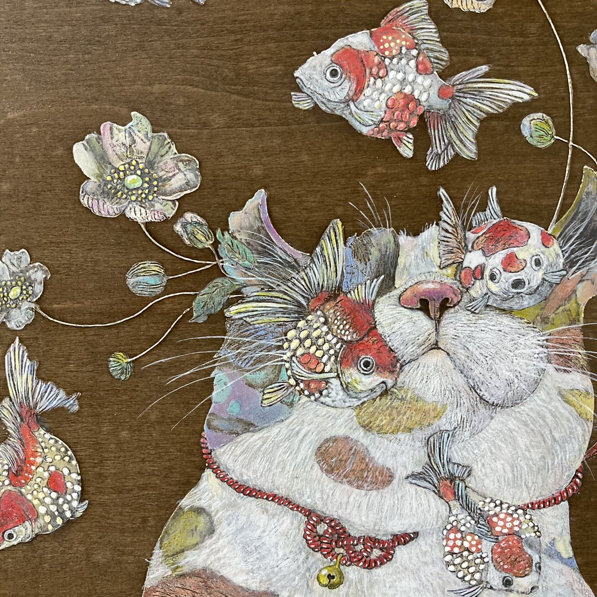 ピンポンパール+ねこを描いてみました~ 「夢見る夢」 27.3×27.3㎝ アクリル、色鉛筆、鉛筆 #illustrationart #冬の創作クラスタフォロー祭り #ねこ #絵描きさんと繫がりたい #色鉛筆画 #金魚 #illustration