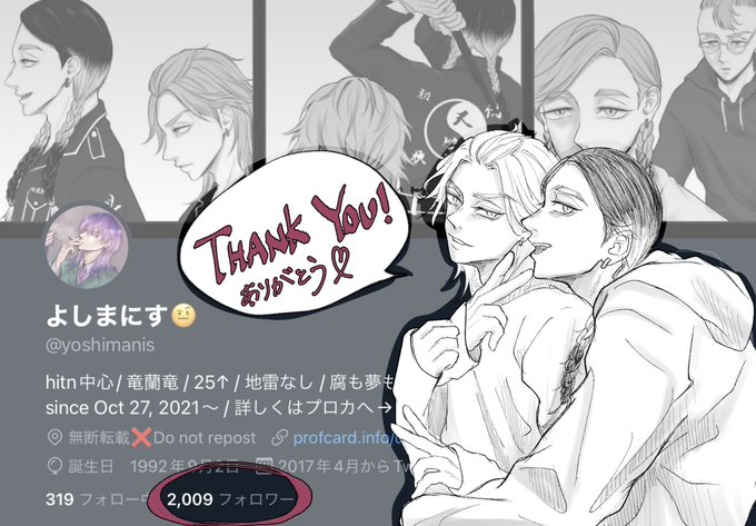 #東卍絵描きさんと繋がりたい #相互の相互さんと繋がりたい 久しぶりにタグやらせて頂きます🙇🏻♀️ ・基本hitnに狂ってます🎊 ・腐も夢も美味しく嗜みます🎊 絵描きさんも文字書きさんもレイヤーさんも、気が合いそうな方RTと♡で巡らせて頂きます! 宜しくお願い致します🐣💕
