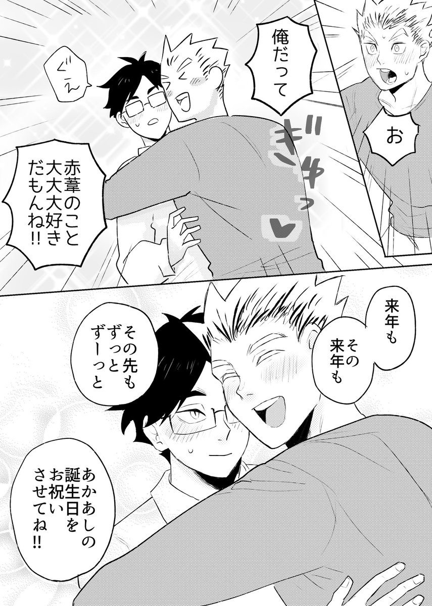 #ぼくたちの赤いいと7 で展示した赤葦おめでとう漫画です! 木兎さん(28)が赤葦(27)のお誕生日をお祝いしてます🎂🎉🥳 ⚠️1コマだけ濃厚なキッスがあります (1/2)