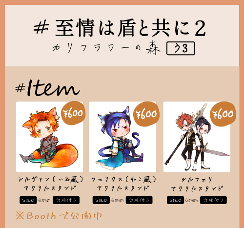 #至情は盾と共に 今日の🍢🛡️イベントお品書き 「う3」でスペースお借りしています アクスタと制作中の新刊サンプル掲載します 企画のネットプリントにも参加しています!