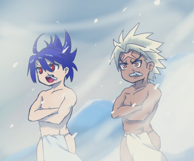 4 7 #神羅お絵かきSS会 冬山で我慢比べをするリュウガとタイガ。 22/11/12 23:20
