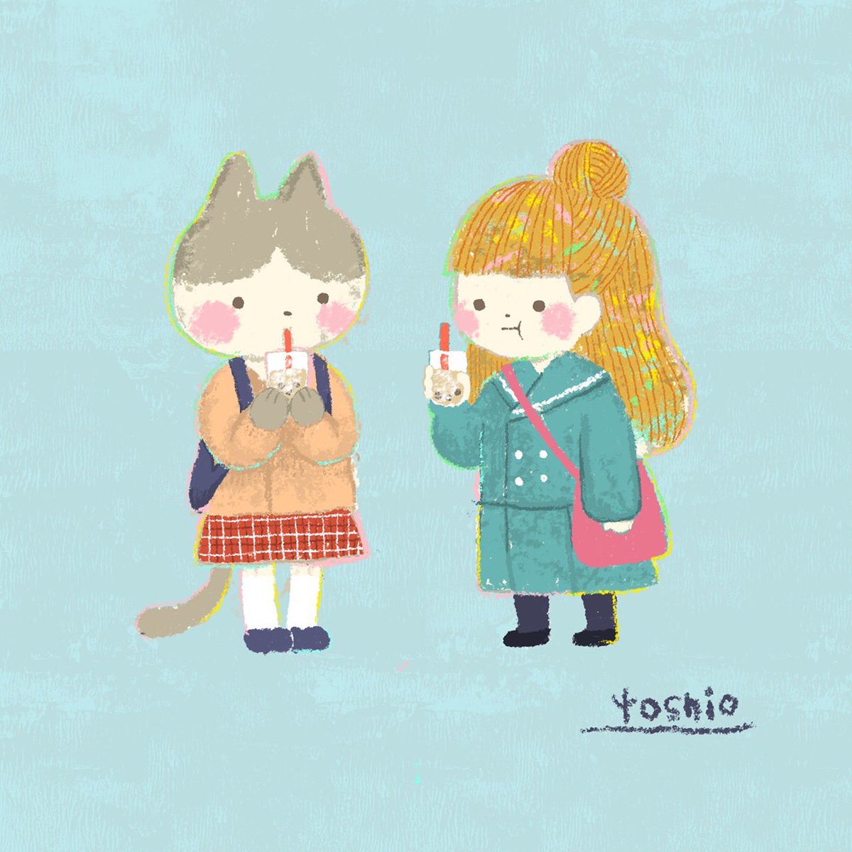 もし私がネコチヤンと住んでたとしたら、学校帰りに待ち合わせして、そこまで興味はないくせにわざわざタピオカ飲みにいったりしたい🧋 おはようございます🌞 女の子が着てるのは私の母校の制服😌笑 #みんなで楽しむTwitter展覧会 #アトリエの系譜 #絵描きさんと繋がりたい