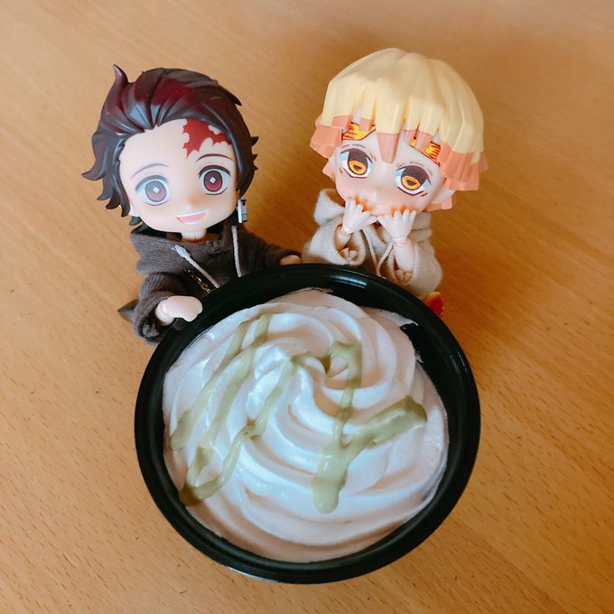 #深夜のねんどろ撮影60分一本勝負 4/9【めしてろ】フライング&既出! 私のおやつの抹茶プリン🍭 甘党2人が見逃すはずもなく… 🎴『おれたちの分もありますよね!』 ⚡️『たべたい!』 とのことで、お裾分けするハメになった時の写真📷 炭治郎も善逸もとても満足げな顔をしていたので結果オーライ!
