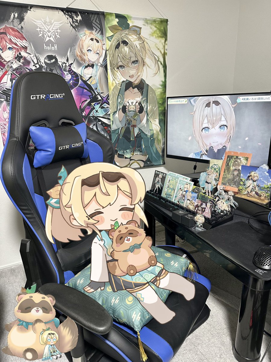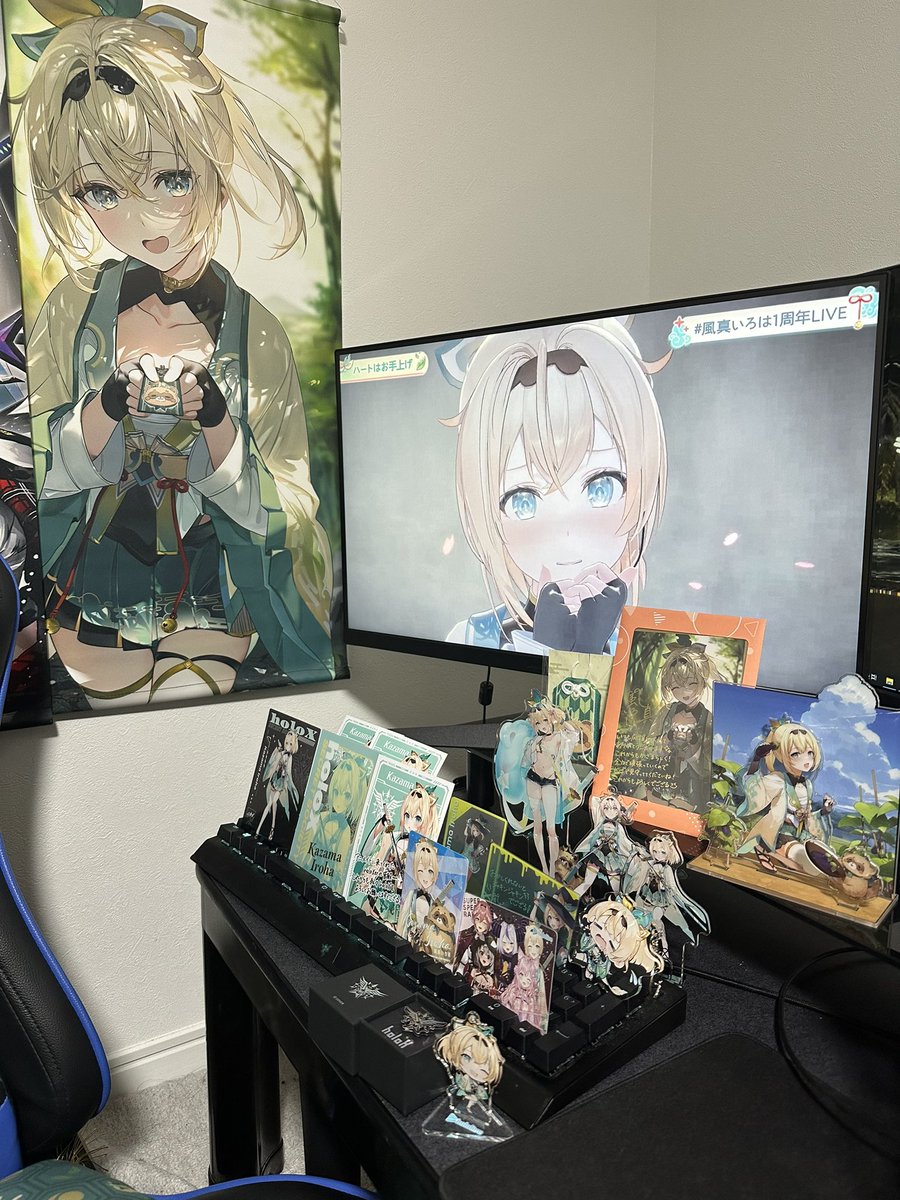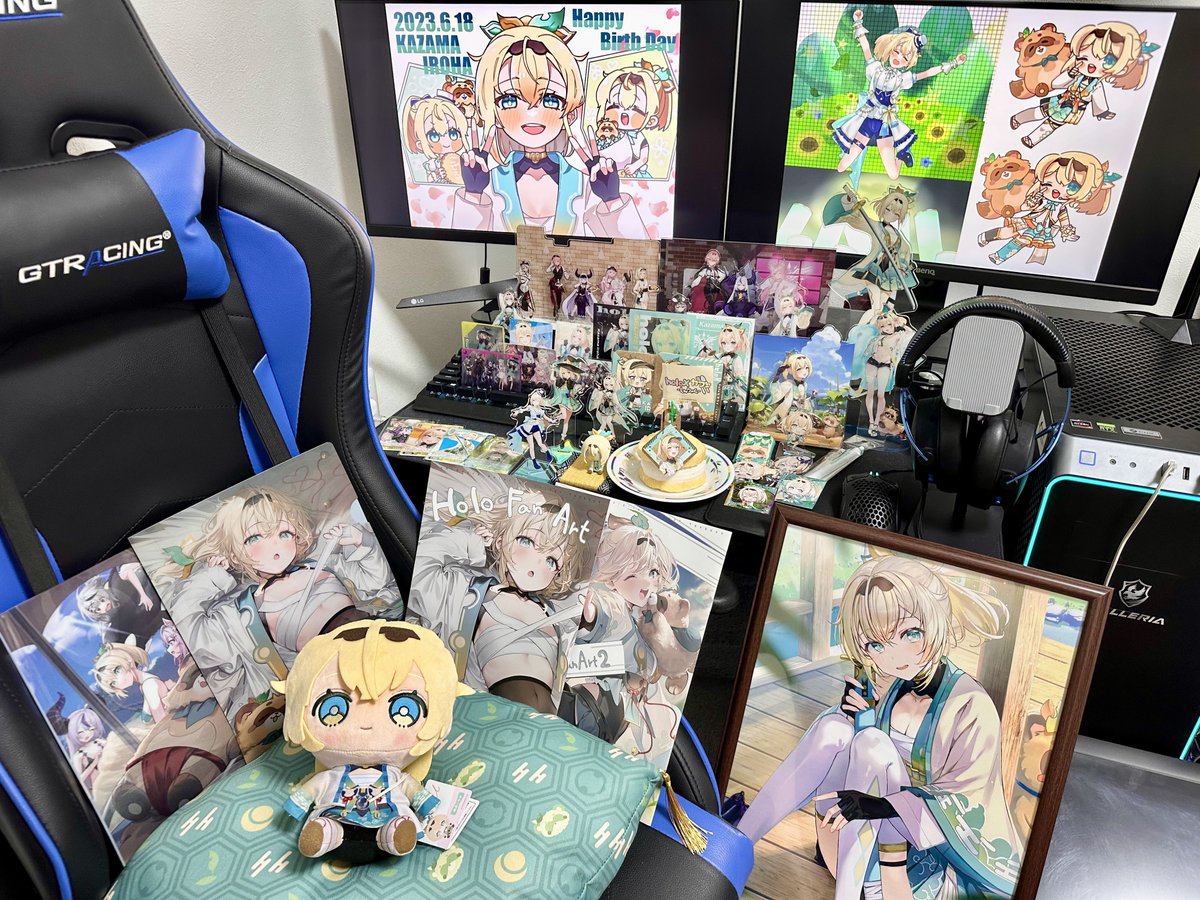 いろはちゃんのバースデーグッズ届いたよ🍃今までのグッズも並べたら居心地良さそうに座ってくれた( ´͈ ᵕ `͈ ) #いろはにも絵を #風真いろは