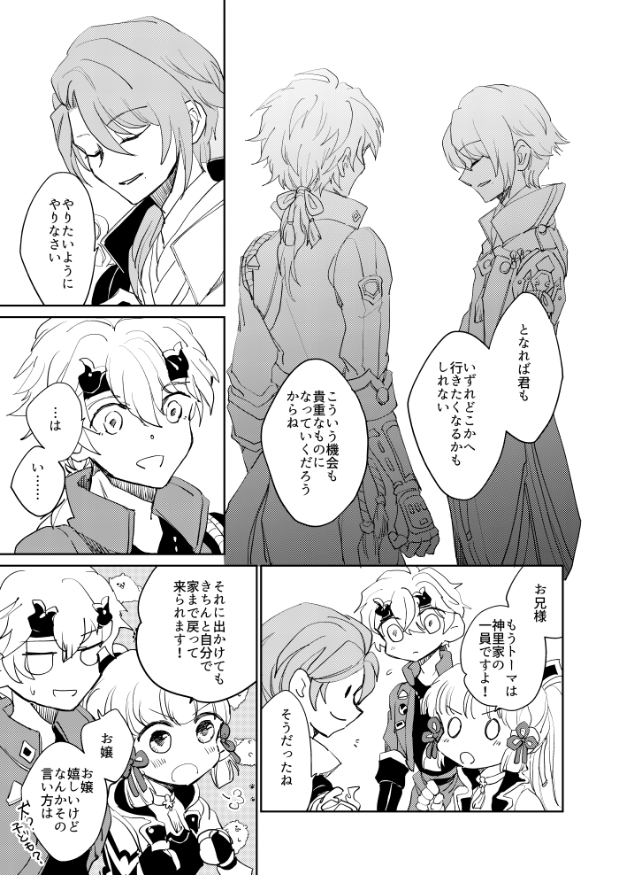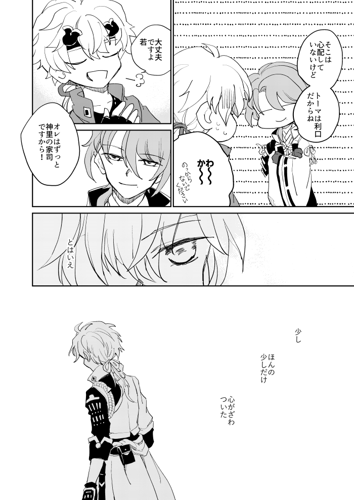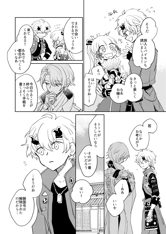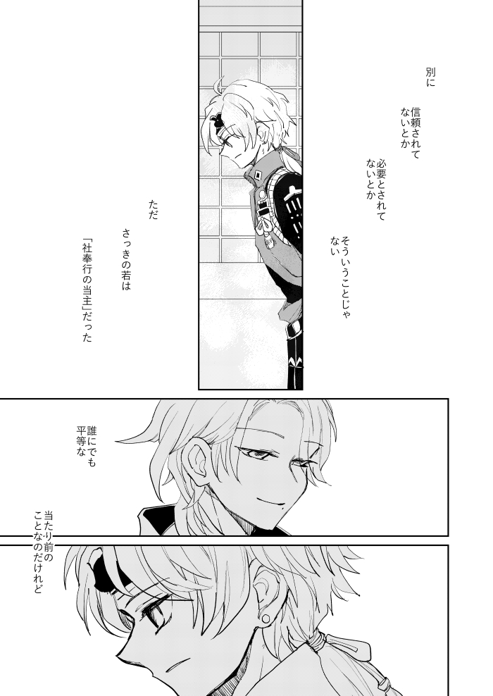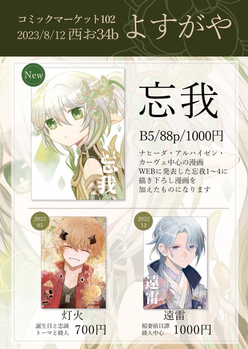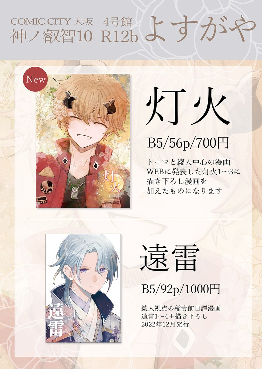 5/28 神ノ叡智10 R12b「よすがや」お品書きです 新刊「灯火」 B5/56ページ/700円 WEB再録+描き下ろし二篇(計11ページ) 詳細:pixiv.net/artworks/10806… 描き下ろしは綾人+雷電将軍のお話と トーマ+綾華のお話の二篇です