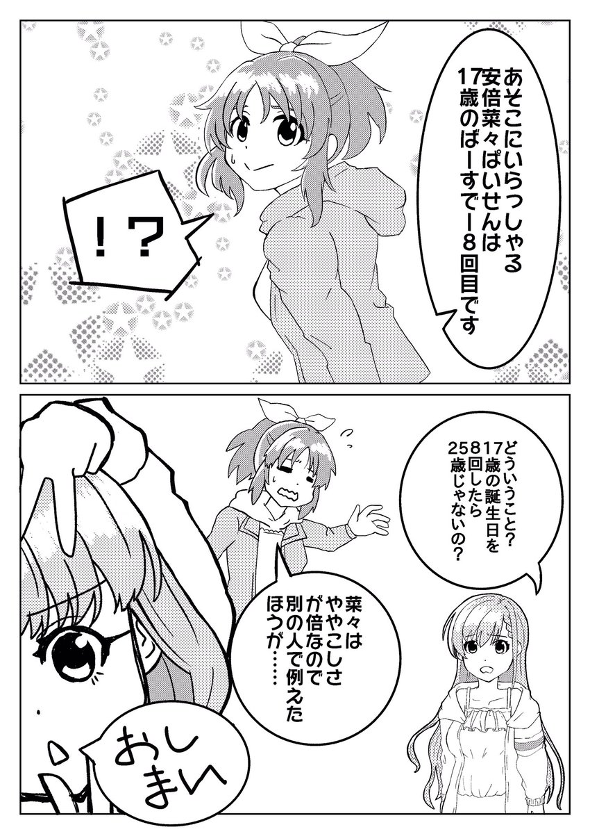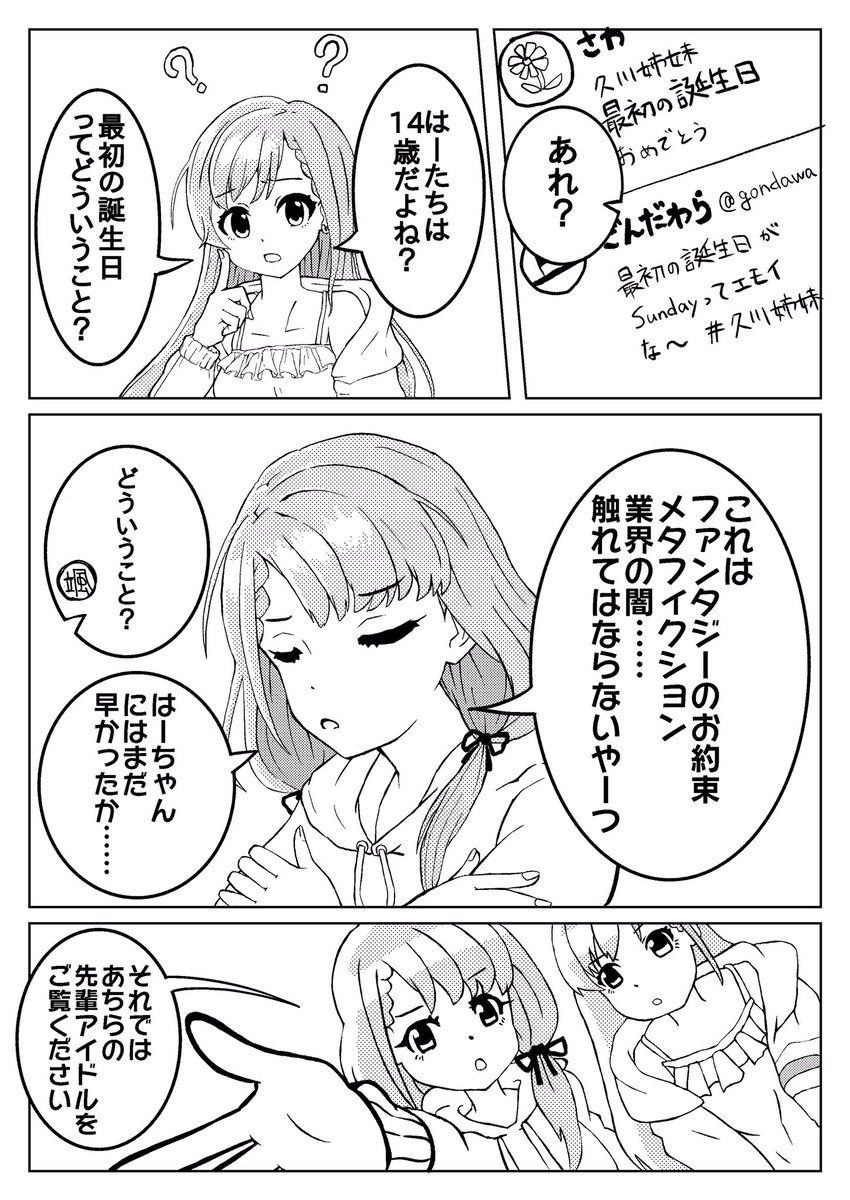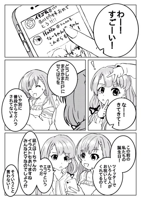 なー!はー! お誕生日おめでとう!! 2年前久川姉妹登場後初の誕生日に描いた漫画再掲します!! 2年前に描いたやつだから時間軸も絵もおかしいけど気にしないで!! #久川姉妹生誕祭2021 #久川凪 #久川颯