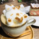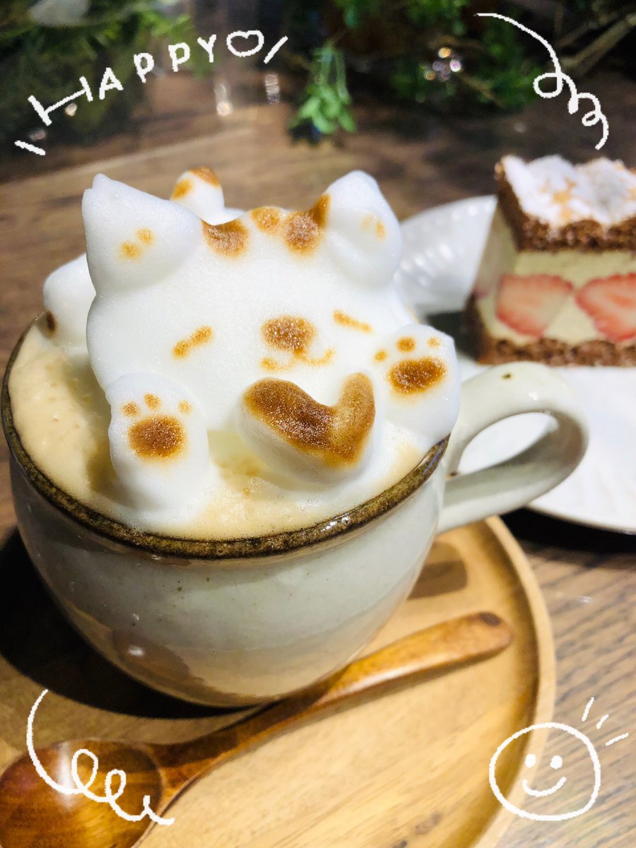 もこもこラテめっちゃかわいい! ケーキも美味しい😋💕 🐱 ☕️