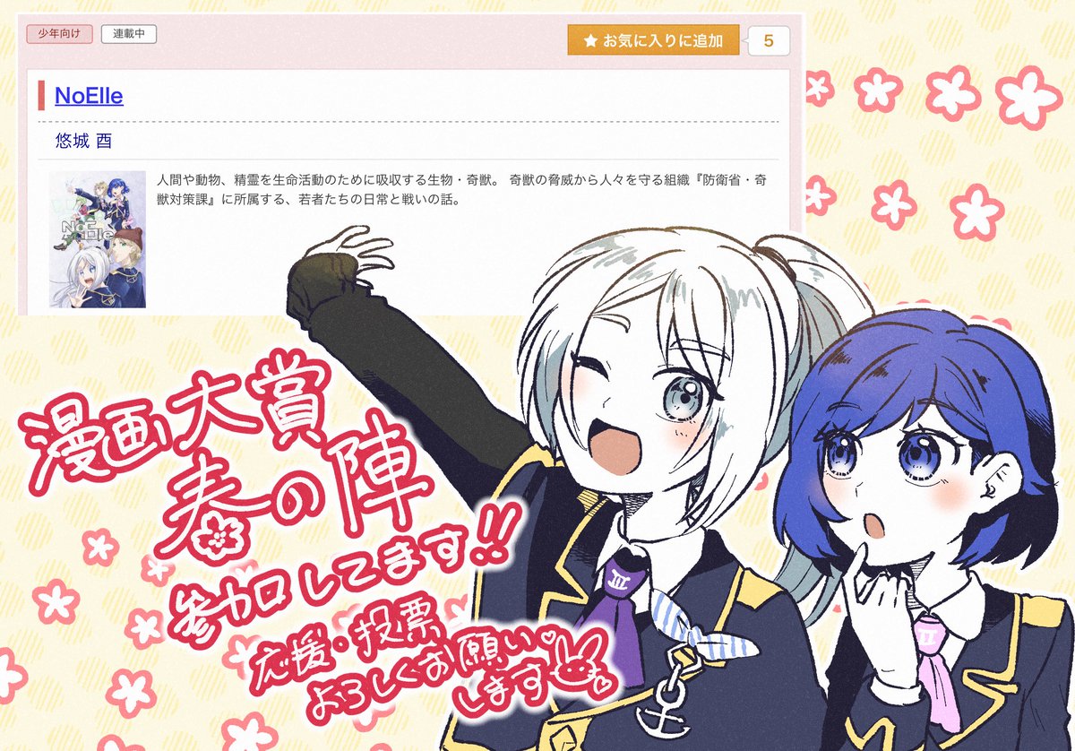 #イラストも物語も両方やってる人フォロー祭り 『NoElle-ノエル-』という中学生〜20代若者中心の、防衛組織(現代風)ファンタジー漫画描いてます。 連載準備、ご依頼等の都合で現在ほぼ隔月ペースで更新中𓂃 𓈒𓏸✎ 和やかな日常風景から厳しい前線の任務まで、興味を持っていただけたら幸いです*゚