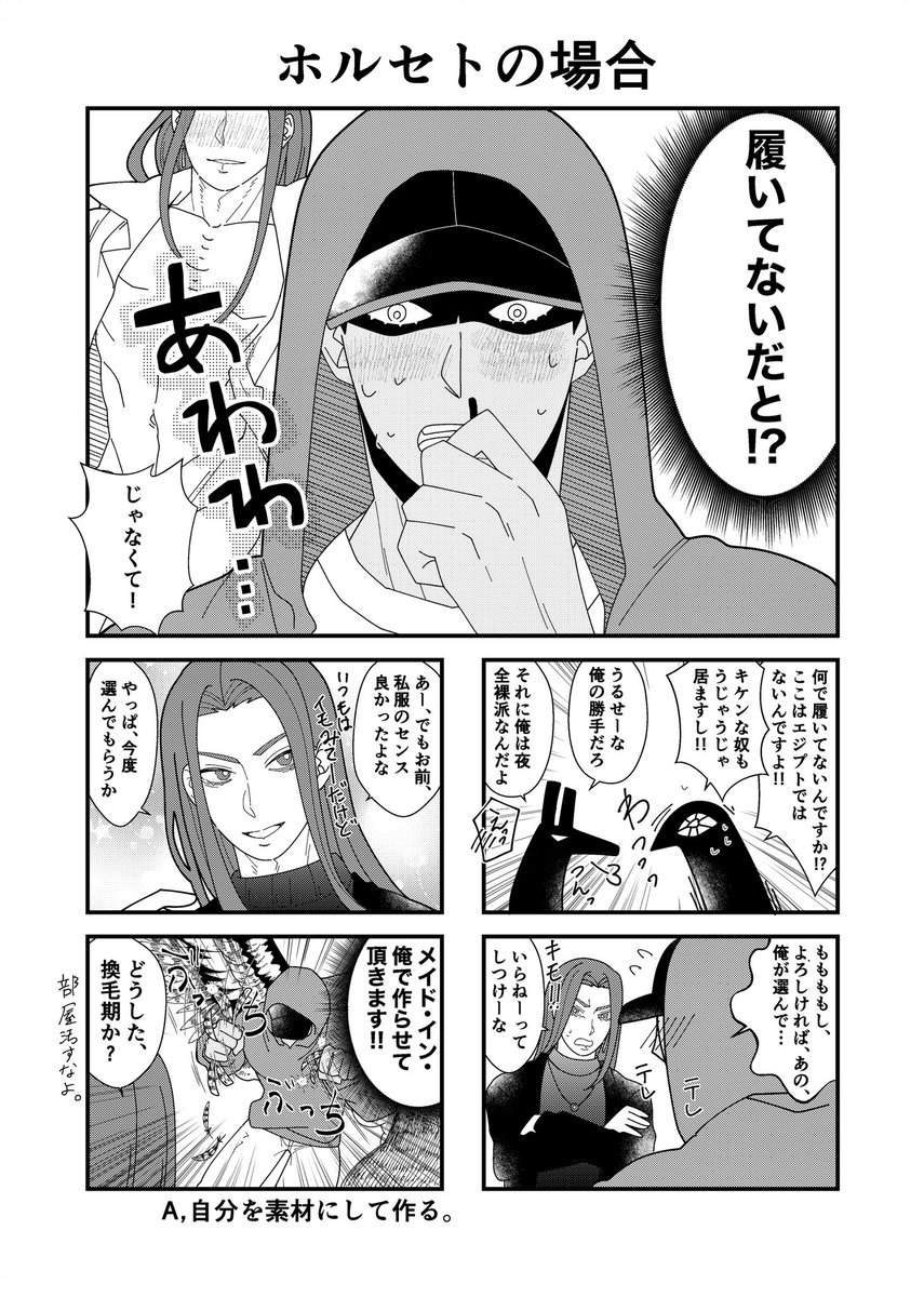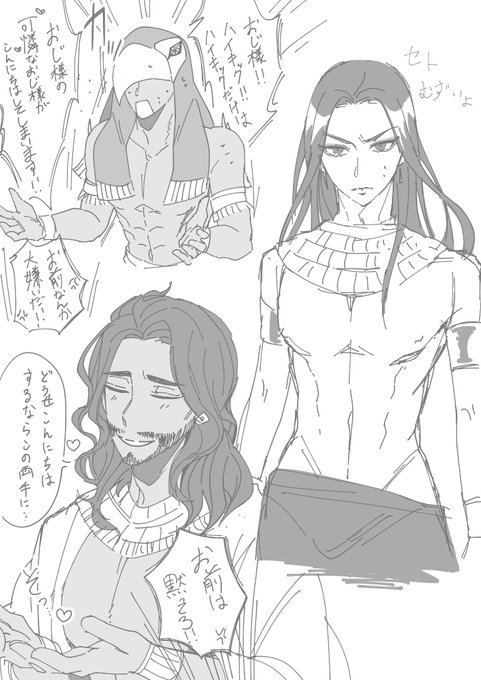 【ホルセト、アヌセト、髭セト】 今日のオンリーで頒布してました無配漫画です!パンツはいてないよ♡なセトに対してそれぞれの攻達の反応漫画です!!オシセトは間に合わなかったので後日上げます😇