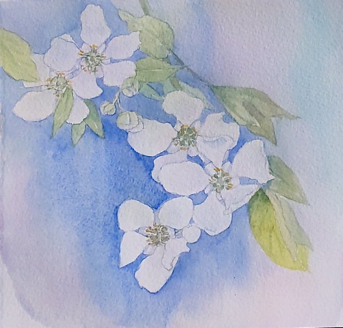 庭の利休梅です。花の1つ1つは清楚ですけど、花数が多いので華やかに見えます。ほんの枝先だけですが描いてみました。(14cm×14センチ) #水彩画 #利休梅