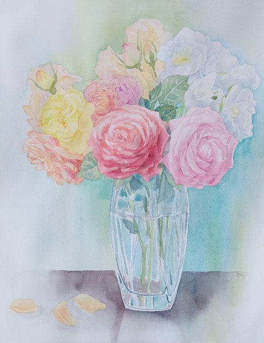 1 8 同じ日に2人の友人から薔薇をいただきました。花瓶にいけたらものすごく豪華な空間になりました。 #水彩画 #薔薇 23/05/24 09:40