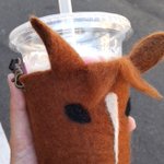 雑な写真でゴメンだけど。 試作品の羊毛製ドリンクカバー馬ver.にも持ち手をつけたので、テストを兼ねて(言い訳)ファミマのピーチフラッペを買って帰宅。美味しくいただきました。 羊毛🐑の保冷力と吸水性、すばらしいのです。 #羊毛フェルト