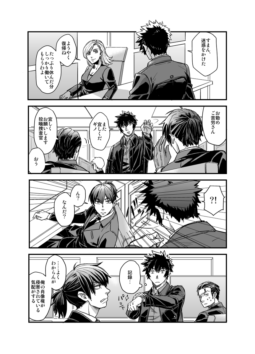 お昼休みの落書きなんだわ。 5年の執行官生活を経た宜野座君の喧嘩っぱやさに、おいおい…ってなる狡噛君はいると思うんだ。