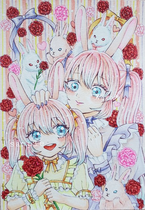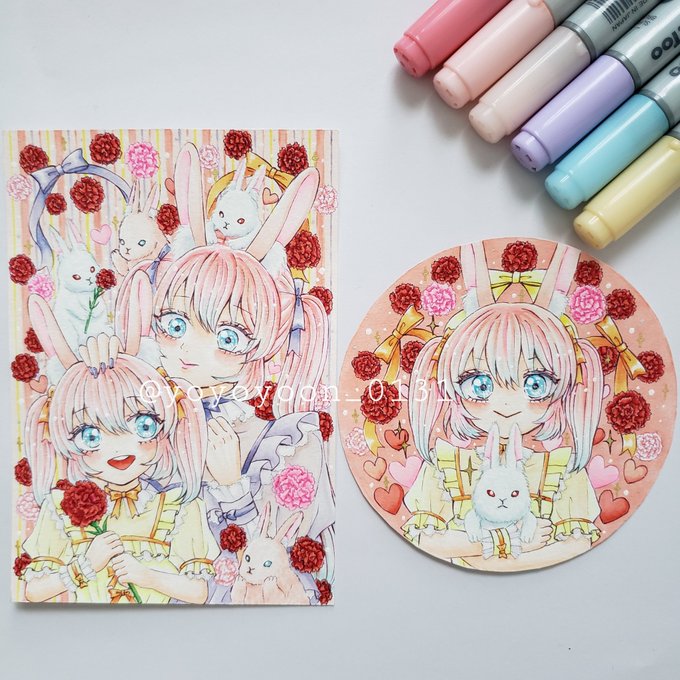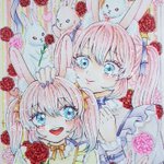 やっと2枚仕上がりました🐇🐇💦 キラキラ使ったのでいい感じになったと思います💖 額装はまた後日💦 次はドローイング???とやらを描きます✍️ #ちいさなタカラモノ展3 #アナログ絵 #コピックイラスト