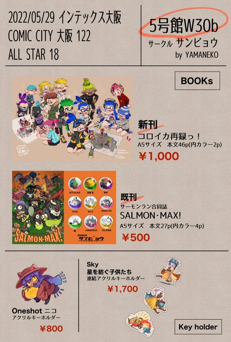 明日の大阪オルスタのお品書きです!新刊のコロイカ再録本の他に再販のサモラン合同誌と、先日の洋ゲーフェスで出したアクキーがちょっとあります!リプに新刊サンプルあげていきます