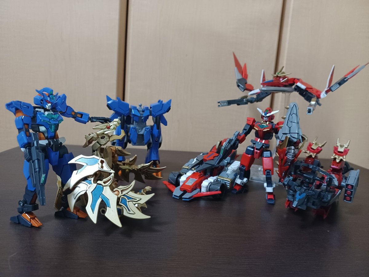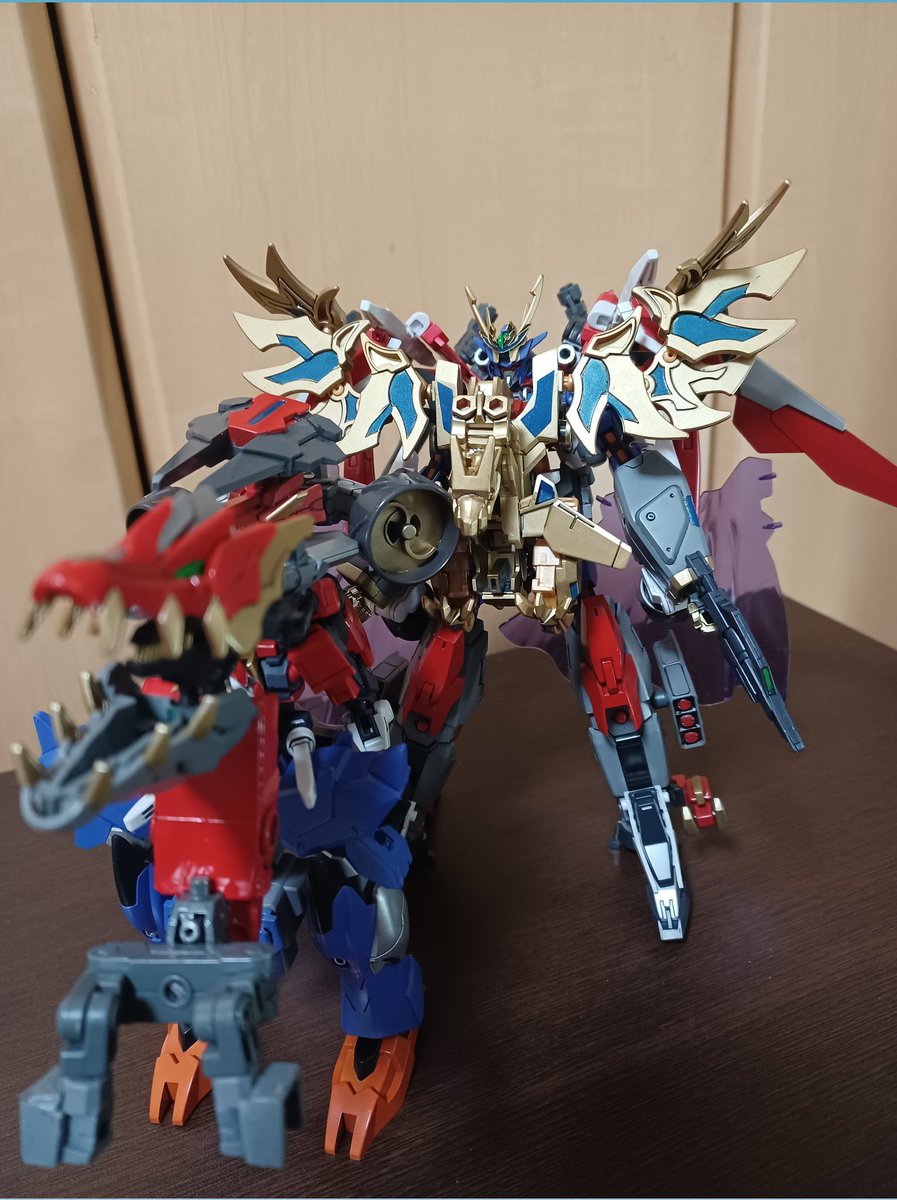 魔改造 #ガンプラ 完成!コアガンダム、ダイナゼノンもどきアーマー!! そして6機合体!カイゼルグリッドナイトもどきアーマー!!(クロスアーマー付き) 各機を差し替えすることで完全変形出来、人型もドラゴンモードへも個別合体も可能です! 長かった~ #ガンプラの画像を貼るとRTされると聞いて