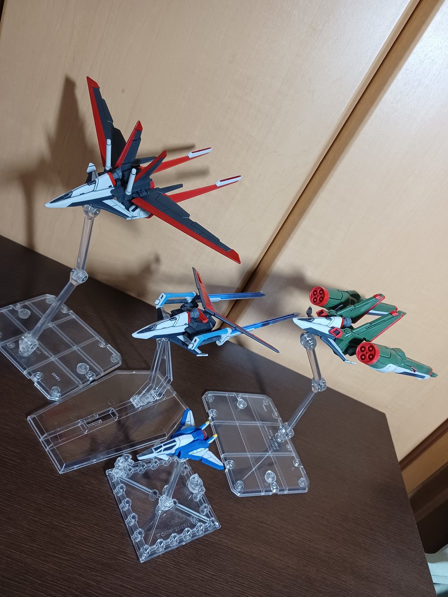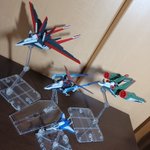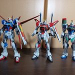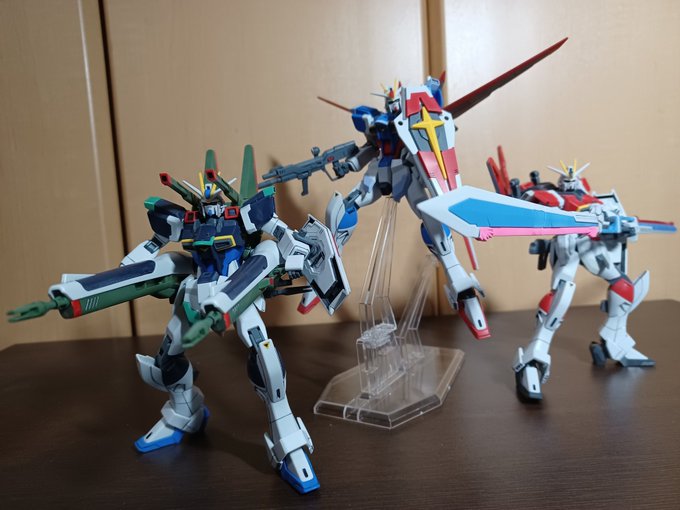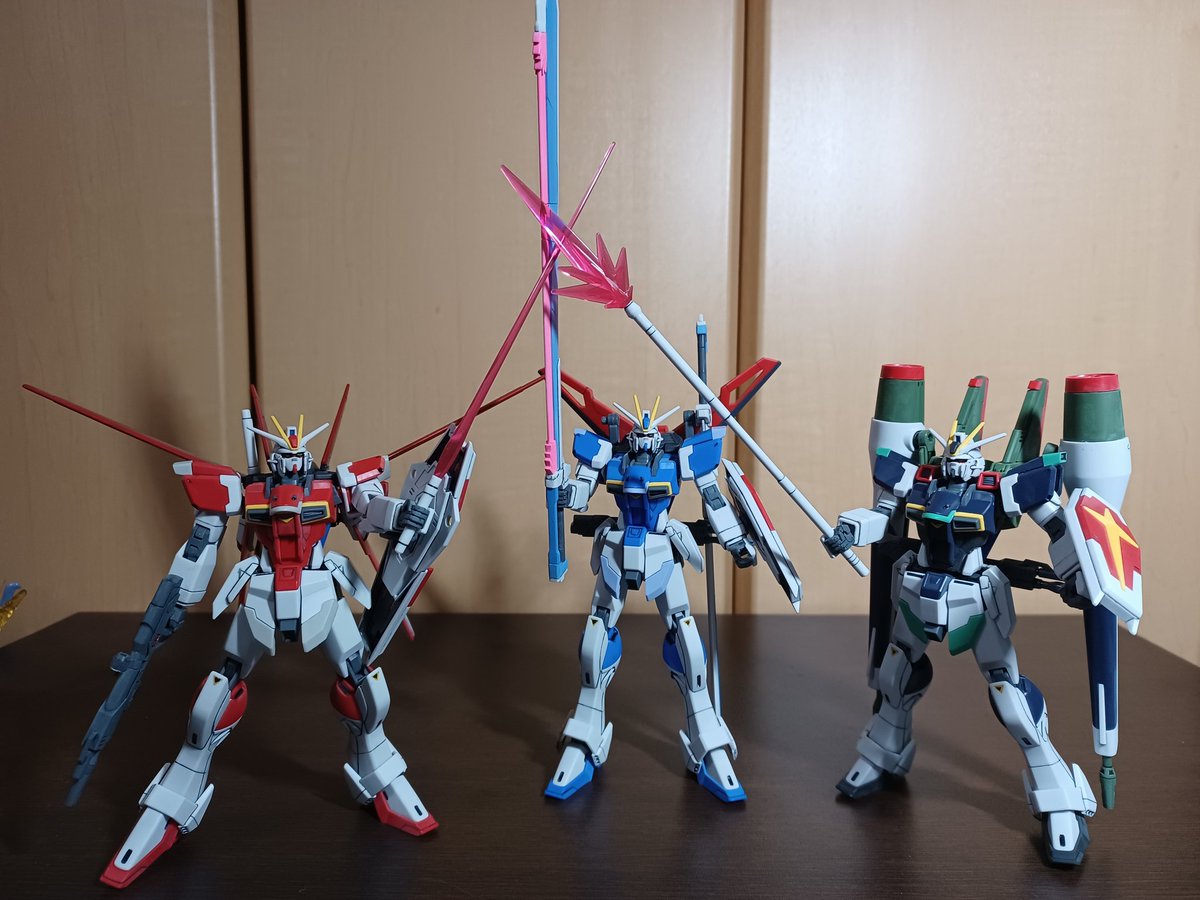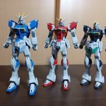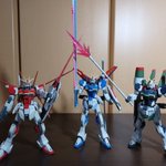 インパルスガンダム3種 #ガンプラ #ガンプラの画像貼るとRTされると聞いて はい、今度こそ完成ですw ブラスト初HG化!とはいってもシルエットは旧FGと基本的に同じ構造ではありますね とはいえこうして3種揃えられると感無量です(*´ω`*) パース剣で宿敵フリーダムをグサッとな