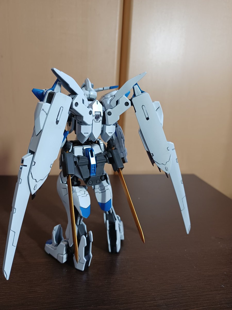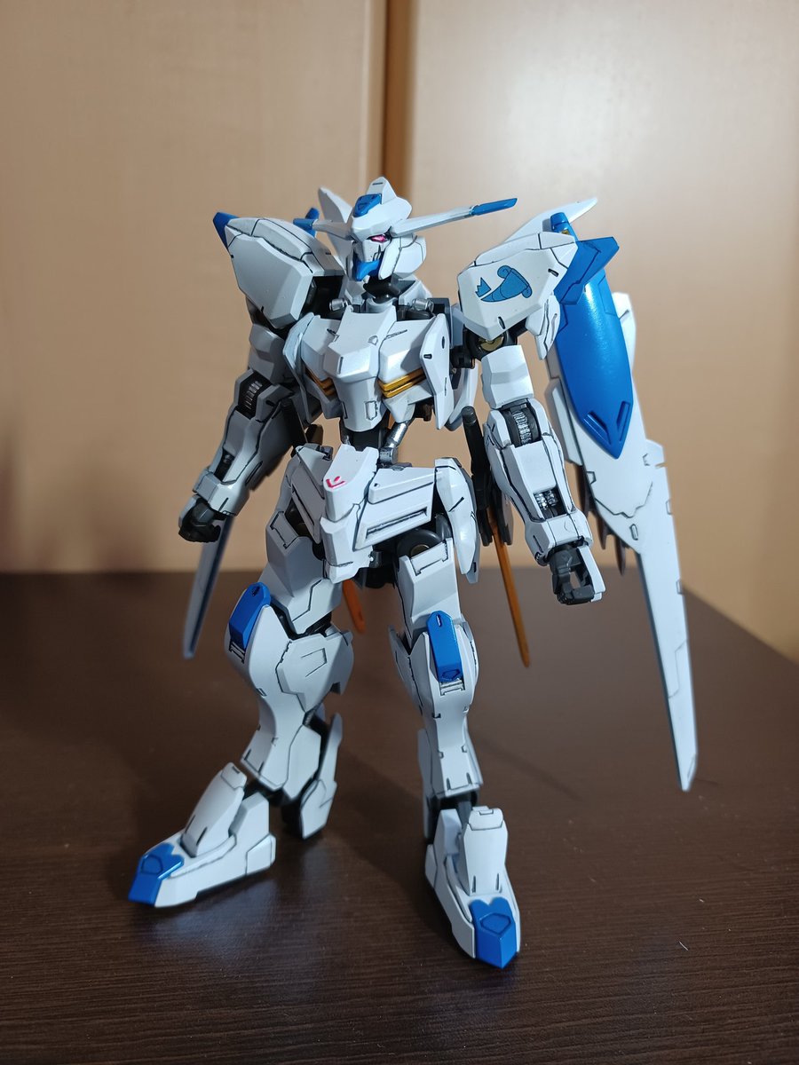 ガンダムバエル #ガンプラ #ガンプラの画像貼るとRTされると聞いて パールでテカテカなバエル完成いたしました~\(^^)/ バルバトス同様に首や腰の底上げ、顎や剣の先端などのシャープ化程度の改修をしてはありますが 艶消し汚しとパール光沢とではまた見え方が違いますなぁ( ゚д゚)