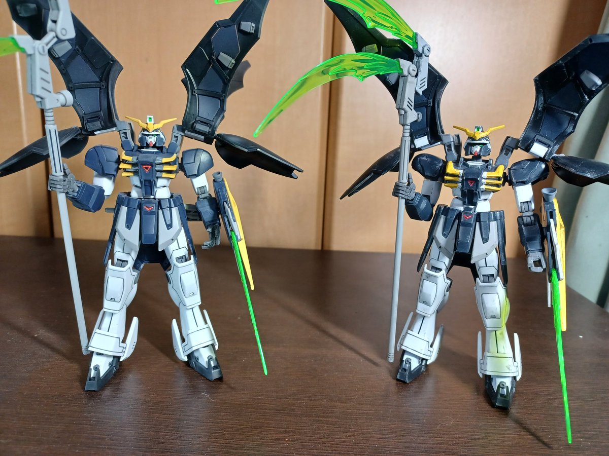デスサイズヘル #ガンプラ #ガンプラの画像貼るとRTされると聞いて 旧キット、HGAC、リヴランスヘブンの3個1完成しました! クロークが前後可動出来るから肩を動かすのに支障ないですが、閉じた時の合いの悪さはご愛顧ってことで…😅 本家HGACがいつ発売かわ分からないけど、近い形に出来たかな?