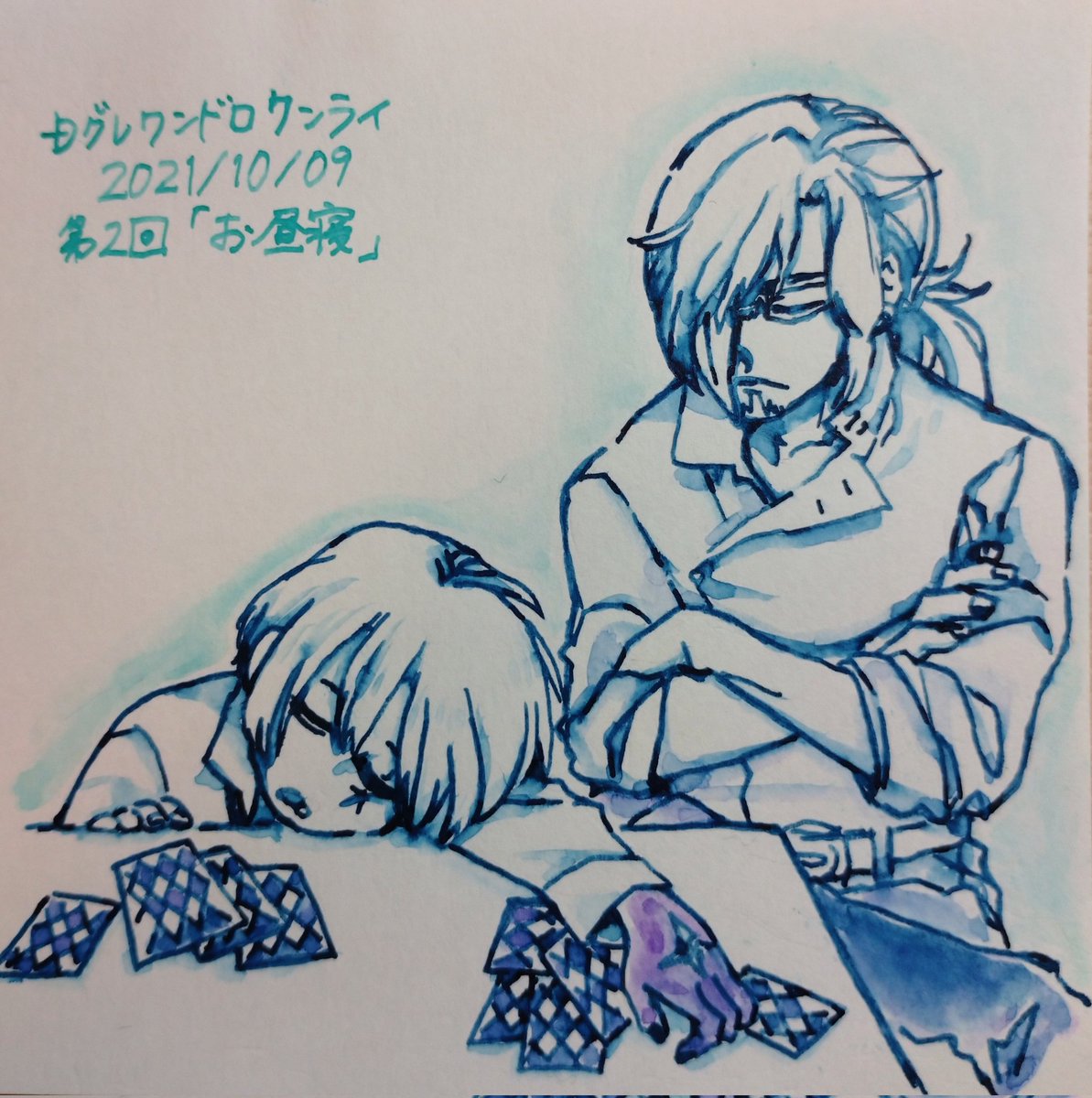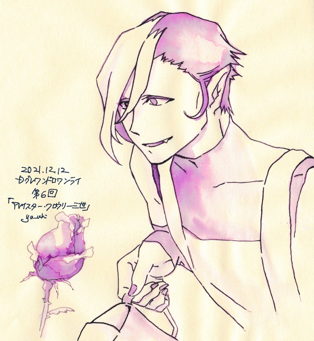 「第6回_アレイスター・クロウリー三世」 紙がべこべこですみません…しっぽ描くの忘れました。 朝起きてお花に水あげるクロちゃん最高ですね @1dr1wr_DGM #Dグレ版深夜の真剣創作60分一本勝負