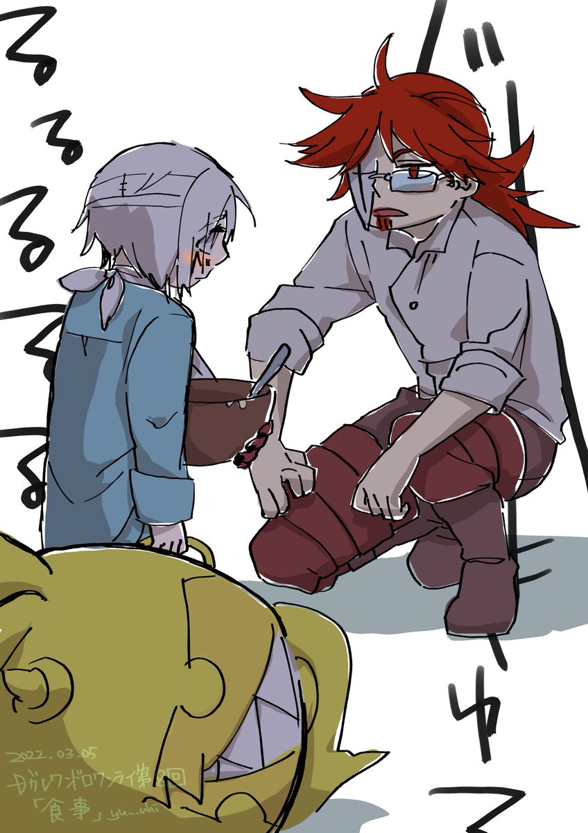 描きたかったネタ 大食らいの片鱗を見せるアレンさん 師匠びっくりしただろうな~と思ったけど、寄生型の特徴は知ってるよなあ、たぶん… @1dr1wr_DGM #Dグレ版深夜の真剣創作60分一本勝負